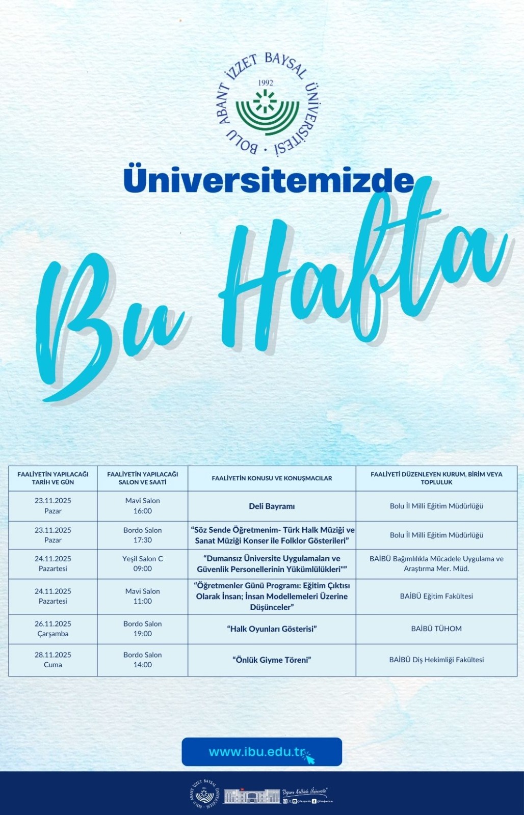 BAİBÜ Kültür ve Kongre Merkezi’nde Bu Hafta 17 Kasım 2025 Haftalık-Aylık-Yıllık Etkinlik Takvimi için : Tıklayınız Mevcut makalenin kısa URL'si : https://ajanda.ibu.edu.tr/5mn4