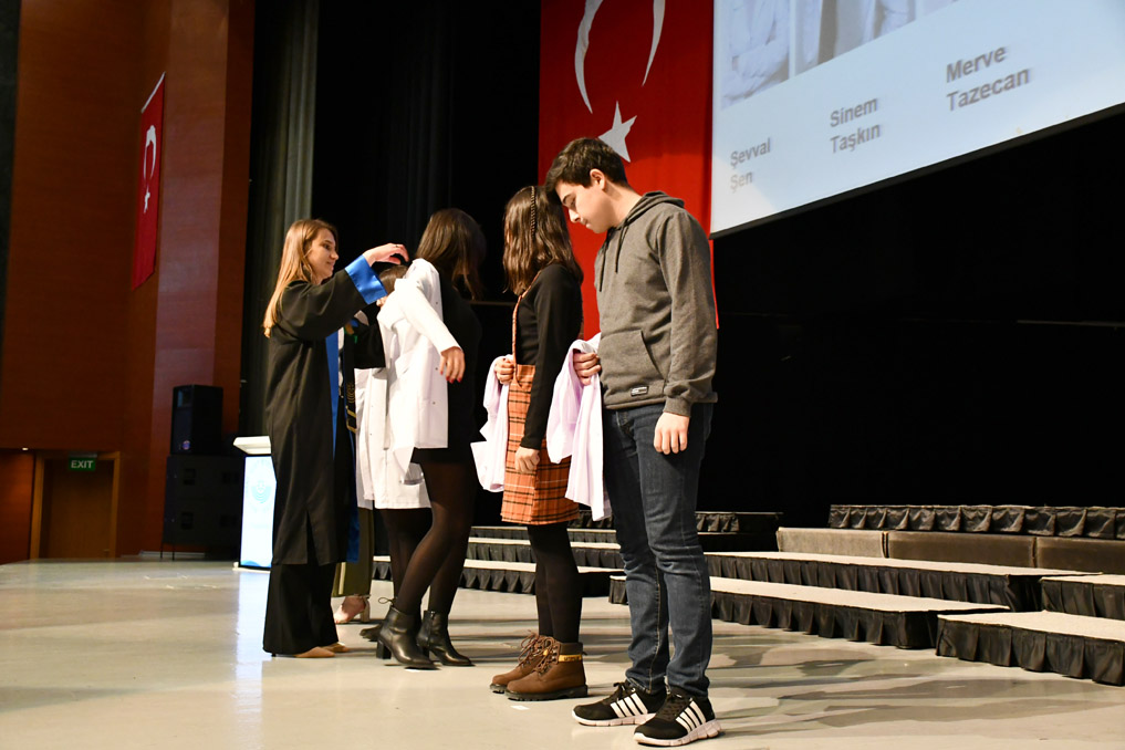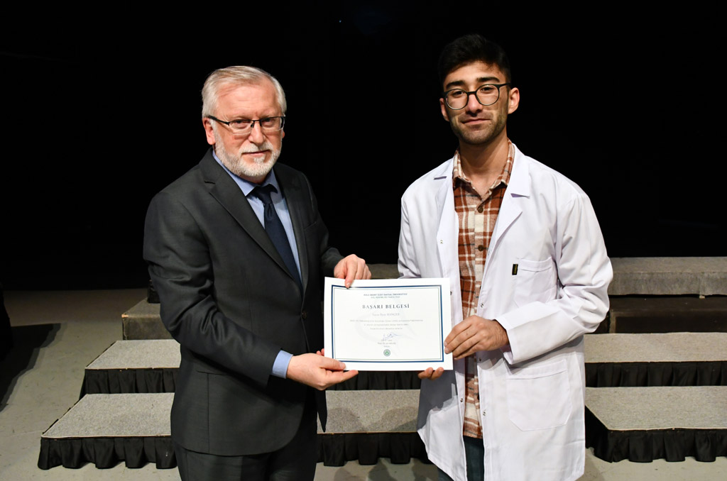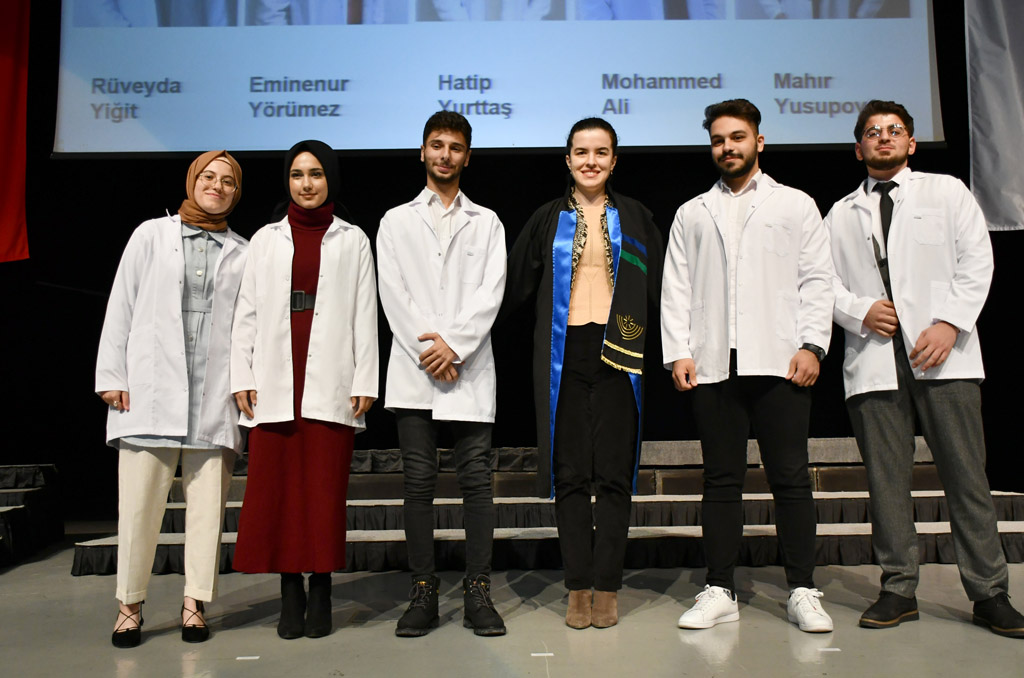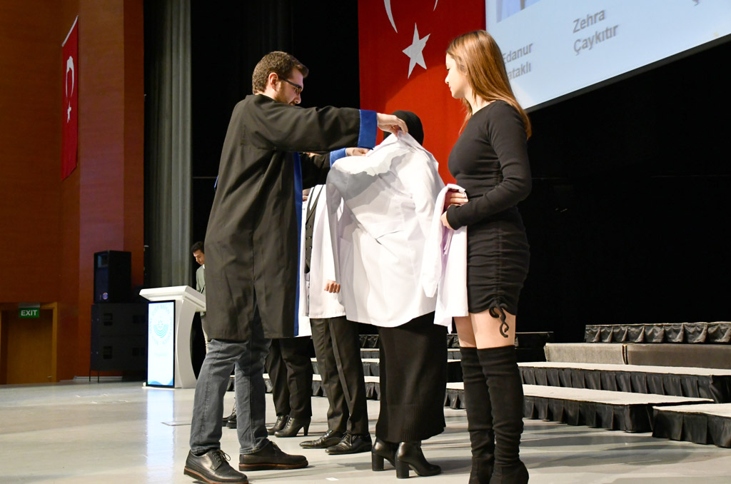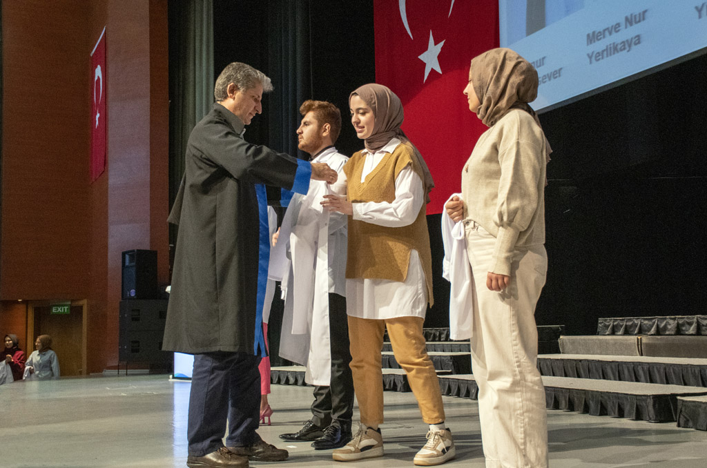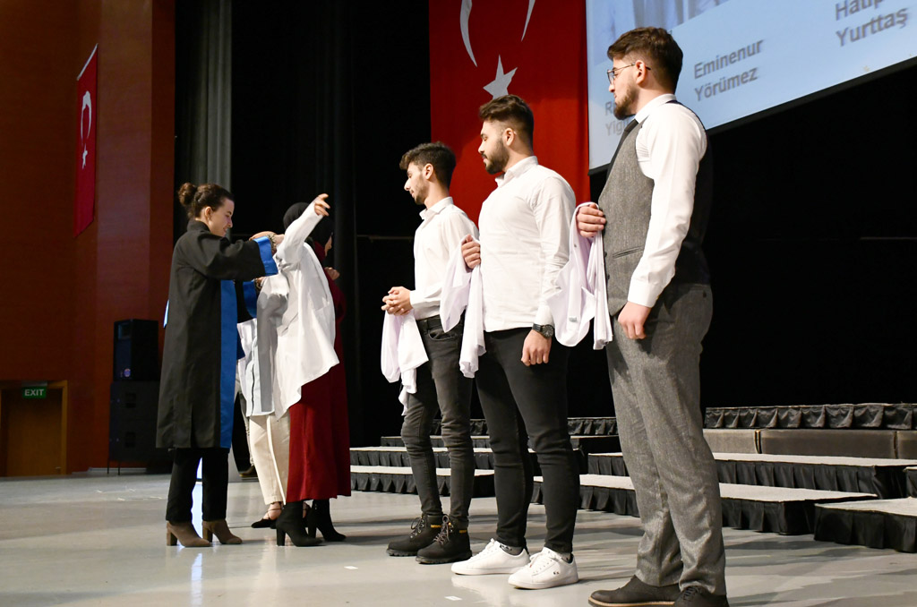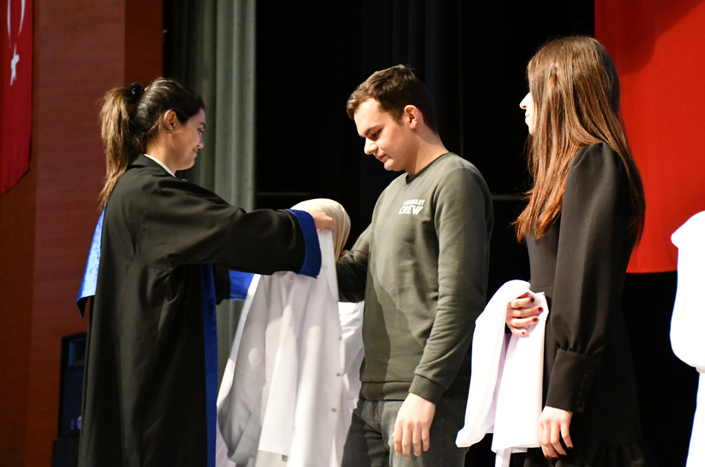 Konuşmasının ardından Rektör Alişarlı, fakülteye dereceyle giren İlyas Hançer’e başarı belgesini verdi ve beyaz önlüğünü giydirdi.