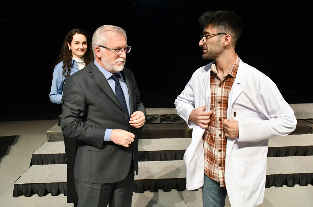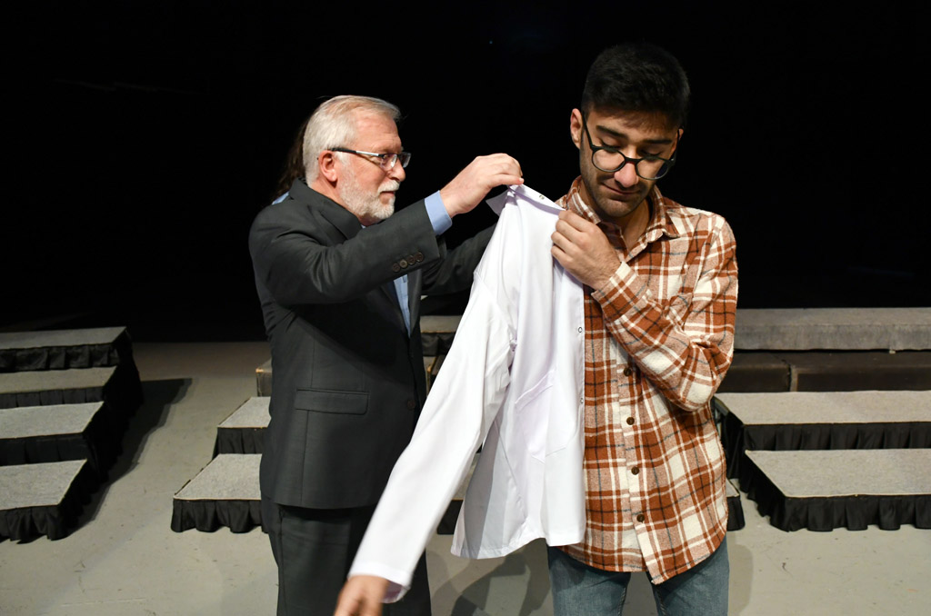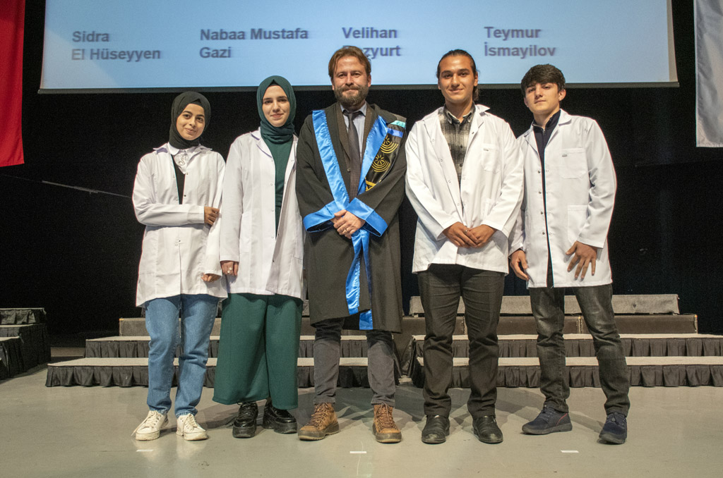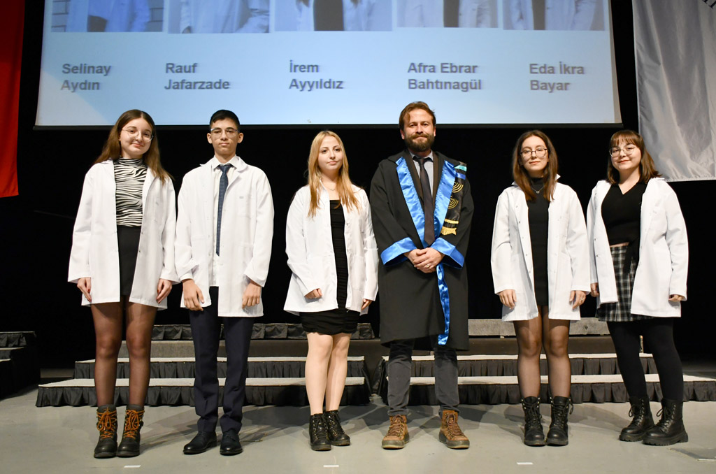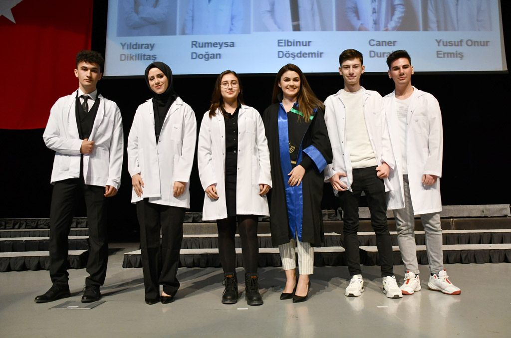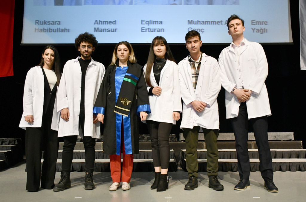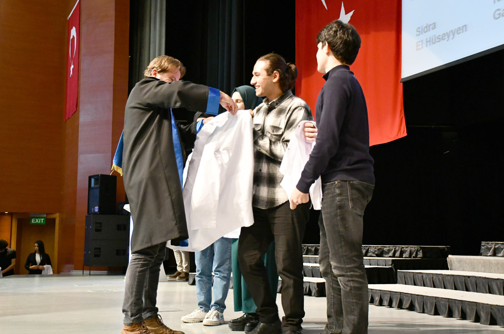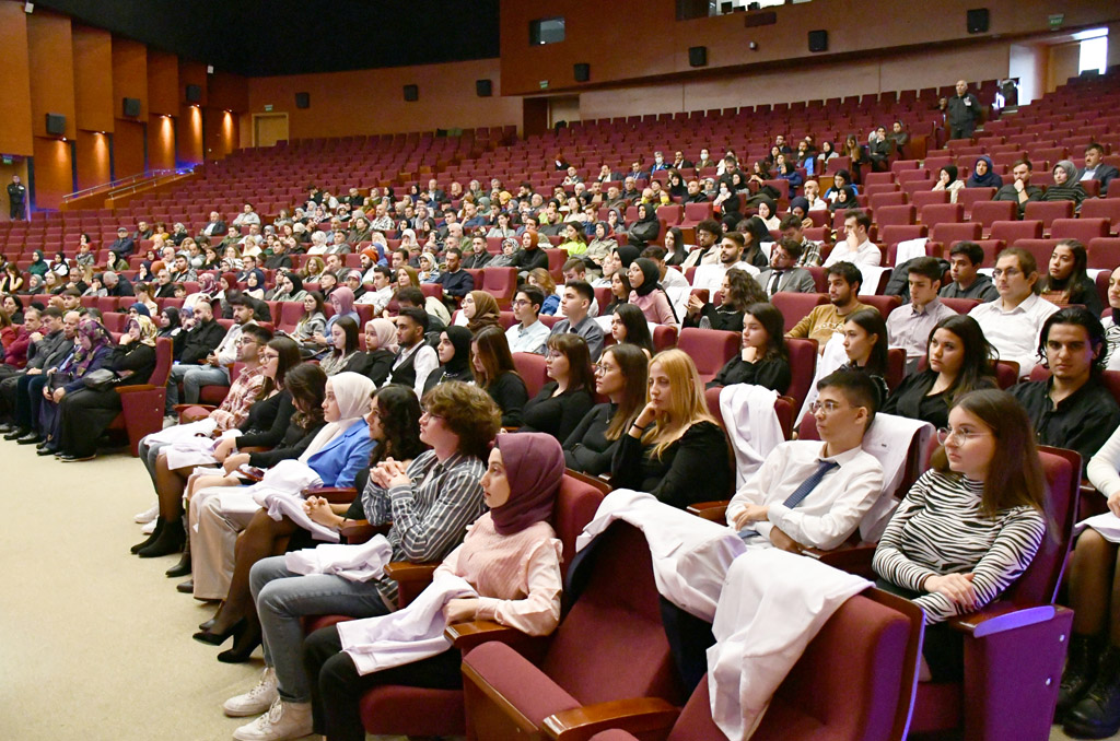 Konuşmasının ardından Rektör Alişarlı, fakülteye dereceyle giren İlyas Hançer’e başarı belgesini verdi ve beyaz önlüğünü giydirdi.