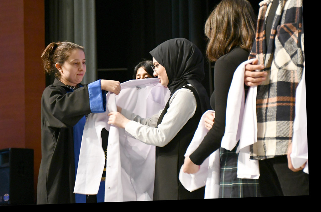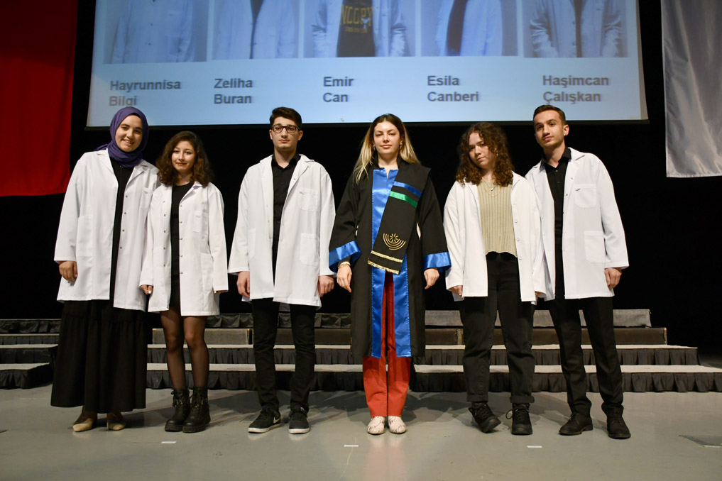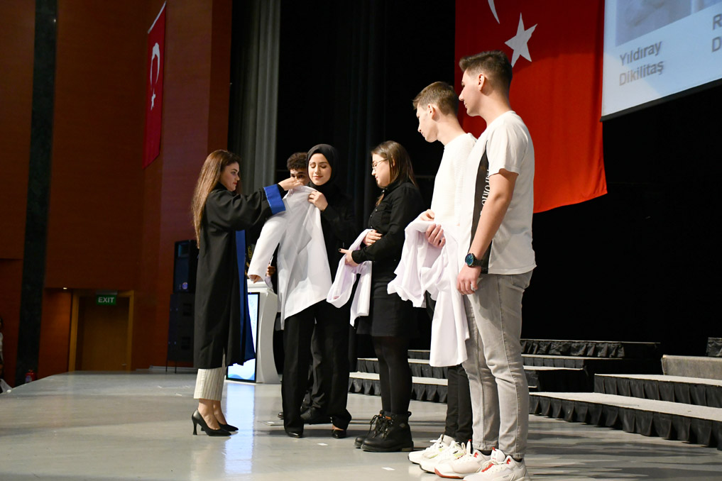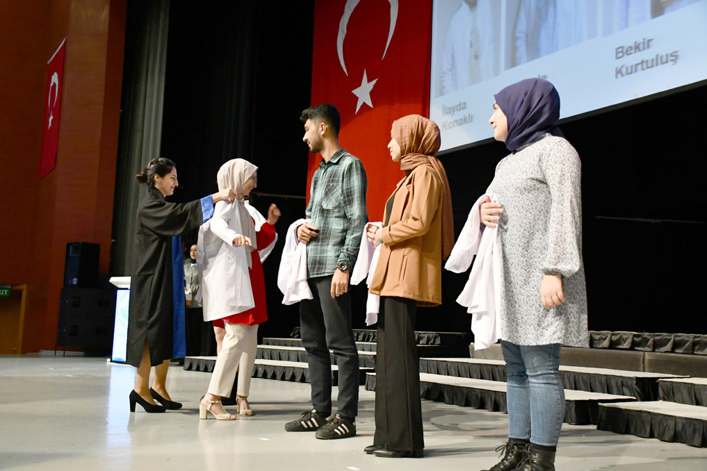 Vali Yardımcısı Şen, konuşmasının ardından fakülteye dereceyle giren Sıla Kaya’ya başarı belgesini verdi ve beyaz önlüğünü giydirdi.