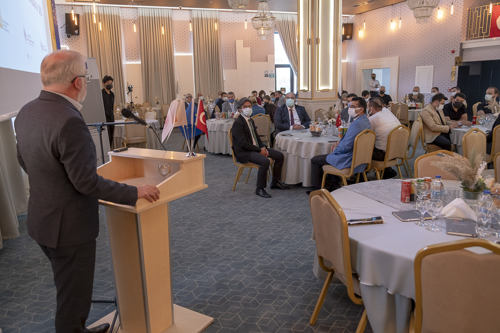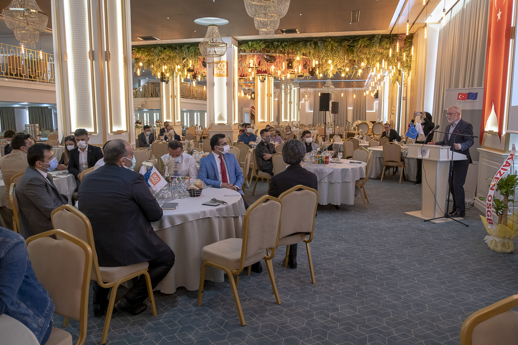 Toplantının açılış konuşmasını yapan Gerede Ticaret ve Sanayi Odası Başkanı Ersin Kaşka, konuşmasına Gerede ilçesi hakkında bilgi vererek başladı. “Gerede 25 bin nüfuslu, İstanbul ve Ankara arasında önemli bir lokasyonda bulunan bir ilçemiz. 2 organize sanayisi var. Türkiye’de çok az örneği olan Uygulamalı Bilimler Fakültemiz ve Meslek Yüksekokulumuz bulunmakta. Geçmişten bugüne İpek Yolu üzerinde, her daim ticaret ve sanayi ile haşır neşir olan bir ilçemiz. Bugün Türkiye’nin en önemli ürünlerinden birini üreten, katma değeri yüksek ürünler üreten bir potansiyele sahip. Yaklaşık 900 yıllık bir geçmişi olan, İbn Battuta ve Evliya Çelebi’nin seyahatnamelerinde de yer alan bir dericilik sektörümüz var. Türkiye’de 14 bölgede dericilik sektörü var, bunlardan biri de Gerede. Gerede’de sadece büyükbaş hayvan derisinden ayakkabılık, çantalık, kemerlik, cüzdanlık deri üretimi yapılıyor. Dolayısıyla yaklaşık 127 deri imalat fabrikası ile Türkiye’nin ayakkabılık deride yaklaşık yüzde 40 potansiyeline sahip. Bununla beraber yıllık 15 milyon adet kemer üretimimiz var. Karma Organize Sanayi Bölgemizde doluluk oranımız çok yüksek. 670 bin metrekarelik yeni bir genişleme alanımız var. 2 milyar nüfusa sahip İslam alemini de ilgilendiren Helal Sığır Jelatin Fabrikası kuruyoruz 2 tane. Bu tesislerin yaklaşık maliyeti 20 milyon Euro civarında ve dünyada bu tesislerden sadece 29 tane var. Cuma günü, Sanayi Bakanımız Mustafa Varank’ın katılımıyla fabrikalarımızdan biri açılıyor. İstihdam sayısı, 100-150 seviyelerinde, ekonomik katma değer olarak da çok yüksek ürünler üreten fabrikalar bunlar.” diye konuştu.
