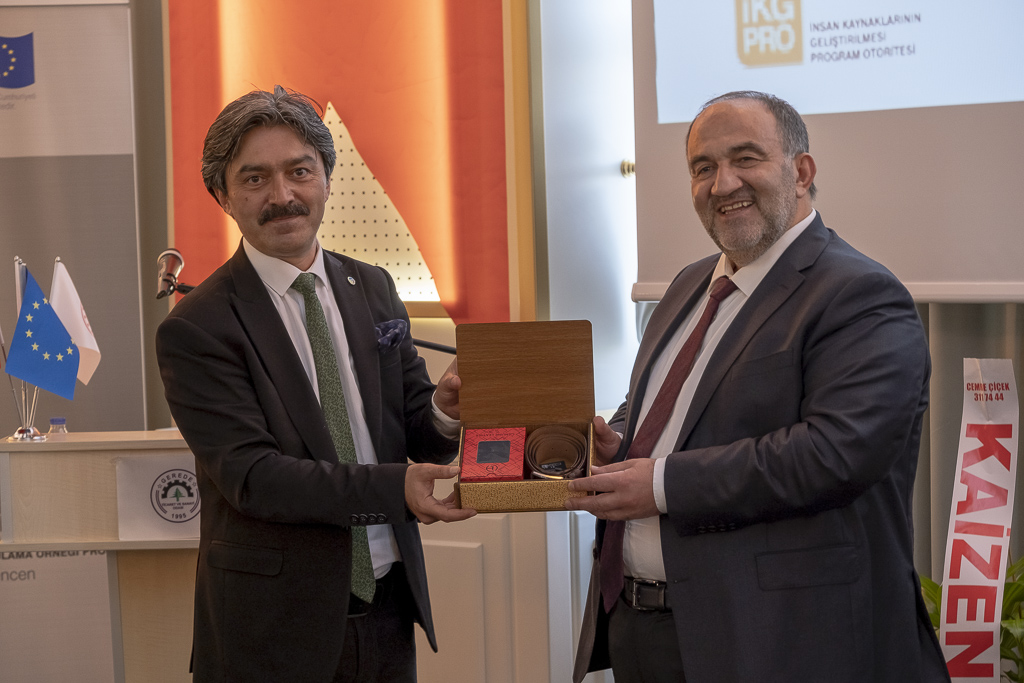 Açılış konuşmalarının ardından projenin tanıtım sunumu, Gerede Meslek Yüksekokulu Deri Teknolojisi Öğretim Görevlisi Recep Soluk tarafından yapıldı. Soluk, özetle “Gerede Ticaret ve Sanayi Odası ile birlikte projeyi hazırladığımız zaman proje toplantıları için Ankara’ya gittik. Burada 400 proje içinden seçilen 37 proje arasında yer aldık. Çalışma ve Sosyal Güvenlik Bakanlığı’nın hedefi, iş yerlerindeki iş güvenliği ve sağlığını iyileştirmek; işverenlerin de hedefi, daha iyi ve daha çalışılabilir iş yaşamı oluşturmak. Aramızda İstanbul Teknik Üniversitesi, Boğaziçi Üniversitesi, Koç Üniversitesi, Marmara Üniversitesi, Uludağ Üniversitesi ve Necmettin Erbakan Üniversitesi’nden katılımcılar var, onlara da geldikleri için teşekkür ediyorum. İşçi Sağlığı ve Güvenliği projesinin kapsamı, iş yeri güvenliğini, çalışan güvenliğini ve çevre güvenliğini sağlamaktır. Dünyada bu işin organizasyonunu yapan UNIDO kurumu var. Faaliyetler, bu kurum şemsiyesi altında yürütülmektedir. Projenin ilk temel hedefi, işgören mutluluğudur. Yani ilk önce çalışanların mutluluğu hedeflenmiştir. İkinci hedefin işveren kârlılığı olması gerekiyor. Bu benim önemsediğim bir durum. Yani, işçilerin işten çocuklarına sağlam dönmelerini sağlamak, işverenlerin ahlaki görevleri ve etik sorumluluğundadır. Projenin ekonomiye katkısı, genel olarak iş güvenliği mevzuatı, iş güvenliğinde yapılması gereken işlemlerin işverene pahalıya mal olduğu düşünülüyor ancak bütün harcamalar aslında işçilerin, işverenlerin ve iş yerlerinin iyileştirilmesi için yapılan harcamalardır. Ayrıca işçi sağlığı ve güvenliğinin önemsenmesi, işçinin moral ve motivasyonunu artırmasını sağlıyor. İşçinin üretkenliğini artırıyor ve uzun vadede iş yerinin kârlılığını sağlıyor.