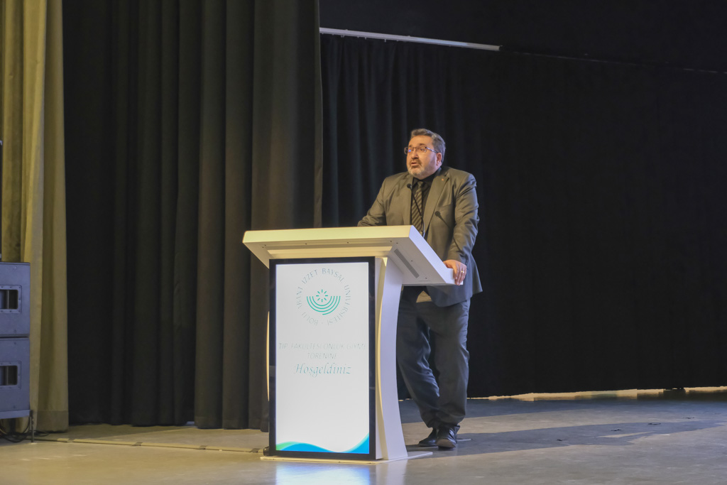 Açılış konuşmasının ardından protokol konuşmalarına geçildi. Rektör Yardımcısı Prof. Dr. Kaya Yıldız yaptığı konuşmada özetle “Bu anlamlı gün, sadece bir kutlama değil; aynı zamanda mesleğin taşıdığı sorumluluğu, fedakârlığı, insan hayatına dokunan yönünü hatırlamak için önemli bir fırsattır. Hekimlik, bilgi ve bilimin ışığında ilerleyen, ancak özünde insan sevgisi, vicdan ve etik değerler barındıran çok önemli bir meslektir. Hekimlik sadece hastaları tedavi etmek değil, aynı zamanda umudu yaşatmak, acıyı paylaşmak, hayatlara dokunmaktır. Bu yönüyle hekimlik her zaman saygıyı ve takdiri hak eden bir meslek olmuştur ve olacaktır. Son yıllarda dünyanın deneyimlediği zorlu süreçler, sağlık çalışanlarımızın ne denli büyük bir özveriyle görev yaptığını bir kez daha açıkça göstermiştir. Gece gündüz demeden, kendi hayatlarını riske atarak insan sağlığı için mücadele eden tüm sağlık çalışanlarımıza minnettarız. Onların emeği, sabrı ve kararlılığı toplumumuzun en büyük güvencelerinden biri olmuştur.” ifadelerini kullandı.
