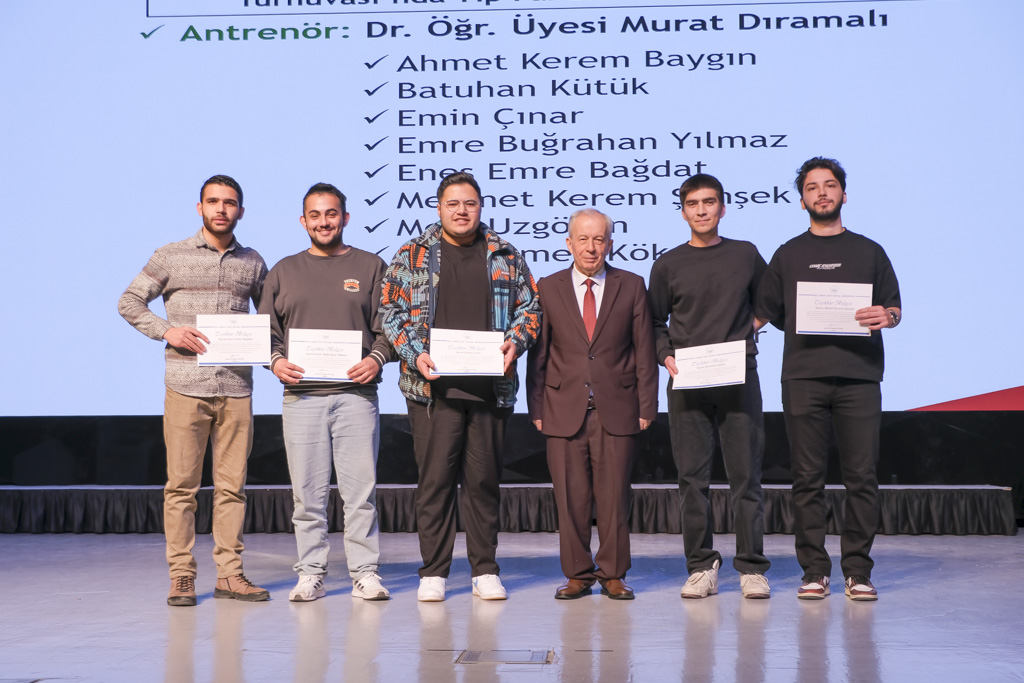 Konuşmaların ardından 2025-2026 Üniversitemiz Fakülteler Arası Basketbol Erkekler Turnuvası şampiyonu ile 2025-2026 Üniversitemiz Fakülteler Arası Kadınlar Voleybol Turnuvası üçüncüsü Tıp Fakültesi takımlarına teşekkür belgeleri takdim edildi. Teşekkür belgeleri, Vali Yardımcısı Hakkı Uzun ve İzzet Baysal Vakfı Mütevelli Heyet Üyesi Mustafa Meterelliyöz tarafından takdim edildi.