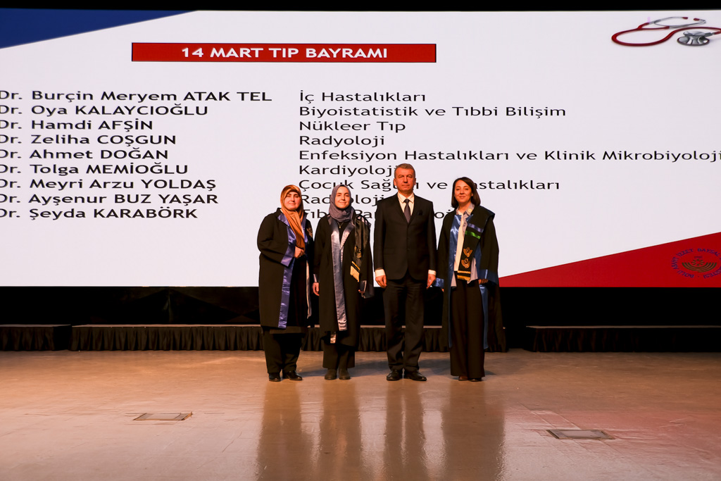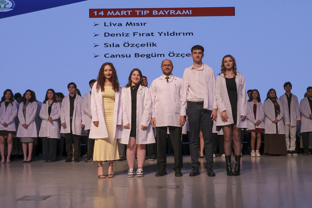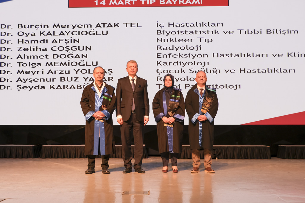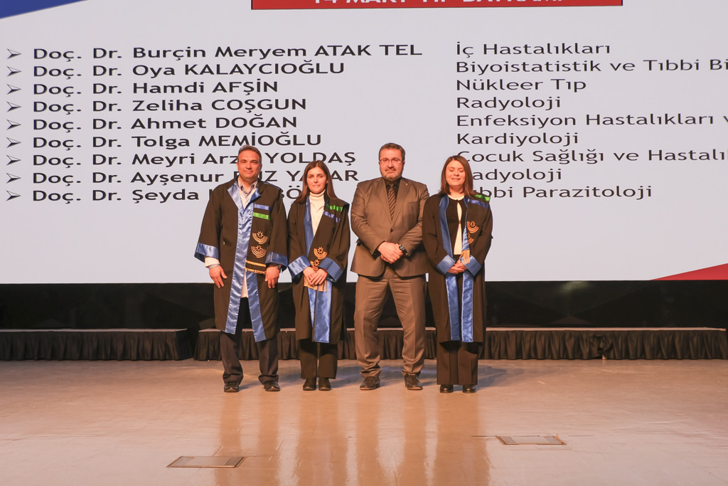 Doçent ünvanı almaya hak kazanan akademisyenlere cübbeleri, Rektör Yardımcıları Prof. Dr. Kaya Yıldız ve Prof. Dr. Ferudun Kaya tarafından giydirildi. Tıp Fakültesi birinci sınıf öğrencilerine ise beyaz önlükleri, protokol üyeleri ve akademisyenler tarafından giydirildi. 14 Mart Tıp Bayramı programı, hatıra fotoğrafı çekilmesinin ardından sona erdi.