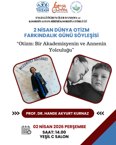 BAİBÜ Engelli Öğrenciler Danışma ve Koordinasyon Birimi Koordinatörlüğü ve Engelsiz Yaşam Topluluğu iş birliğiyle tarafından, 2 Nisan Dünya Otizm Farkındalık Günü kapsamında düzenlenen Otizm Pandomim Gösterisi ve Otizm: Bir Akademisyenin ve Annenin Yolculuğu başlıklı söyleşi Prof. Dr. Hande Akyurt Kurnaz’ın katılımıyla 2 Nisan 2026 Perşembe günü saat 14.00’te Yeşil C Salon’da gerçekleştirilecektir.