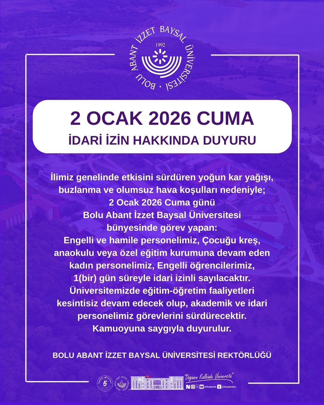 İlimiz genelinde etkisini sürdüren yoğun kar yağışı, buzlanma ve olumsuz hava koşulları nedeniyle; 2 Ocak 2026 Cuma günü Bolu Abant İzzet Baysal Üniversitesi bünyesinde görev yapan:​Engelli ve hamile personelimiz, Çocuğu kreş, anaokulu veya özel eğitim kurumuna devam eden kadın personelimiz,​Engelli öğrencilerimiz 1(​bir) gün süreyle idari izinli sayılacaktır.