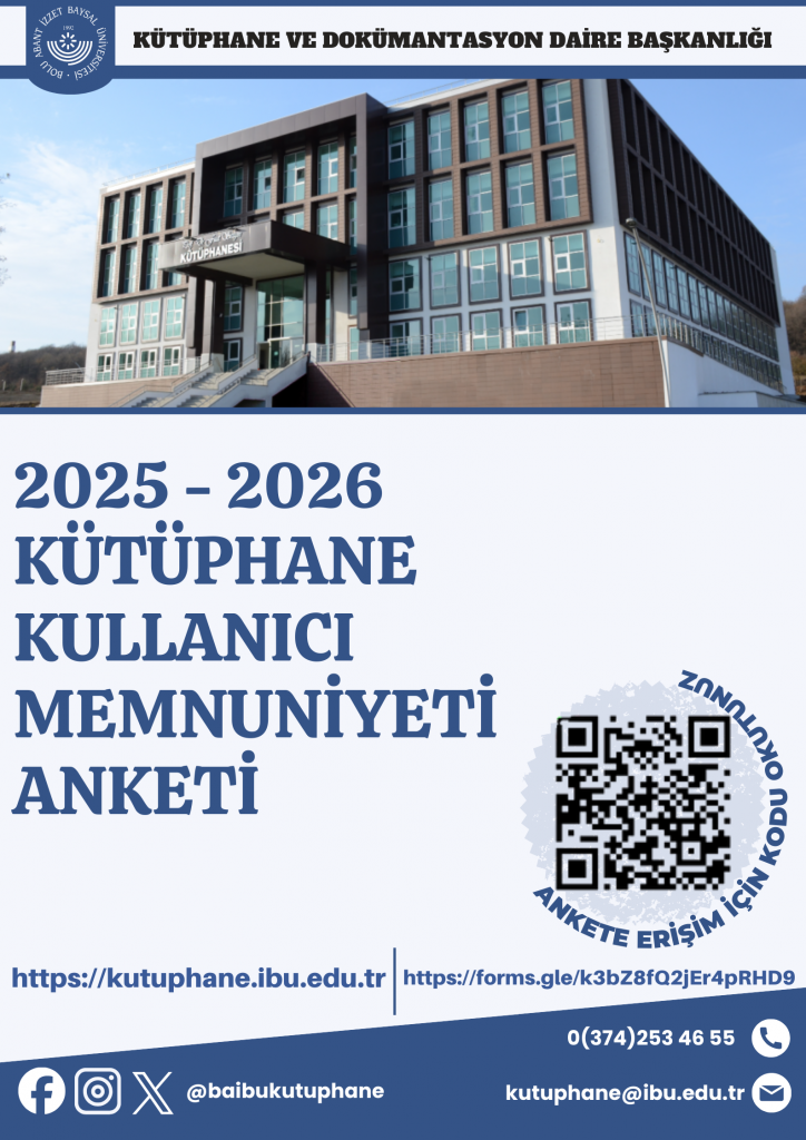 Üniversitemiz Kütüphane ve Dokümantasyon Daire Başkanlığı tarafından, sunulan hizmetlerin kalitesini artırmak ve kullanıcı beklentilerini daha iyi analiz edebilmek amacıyla 2025–2026 Kütüphane Kullanıcı Memnuniyeti Anketi hazırlanmıştır.