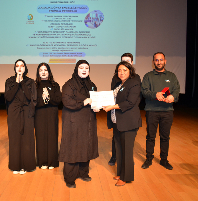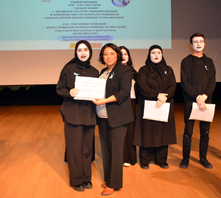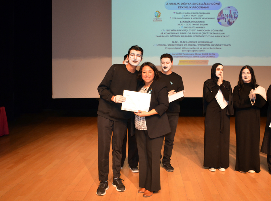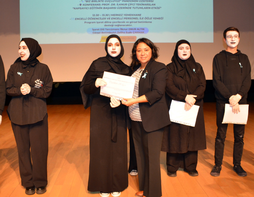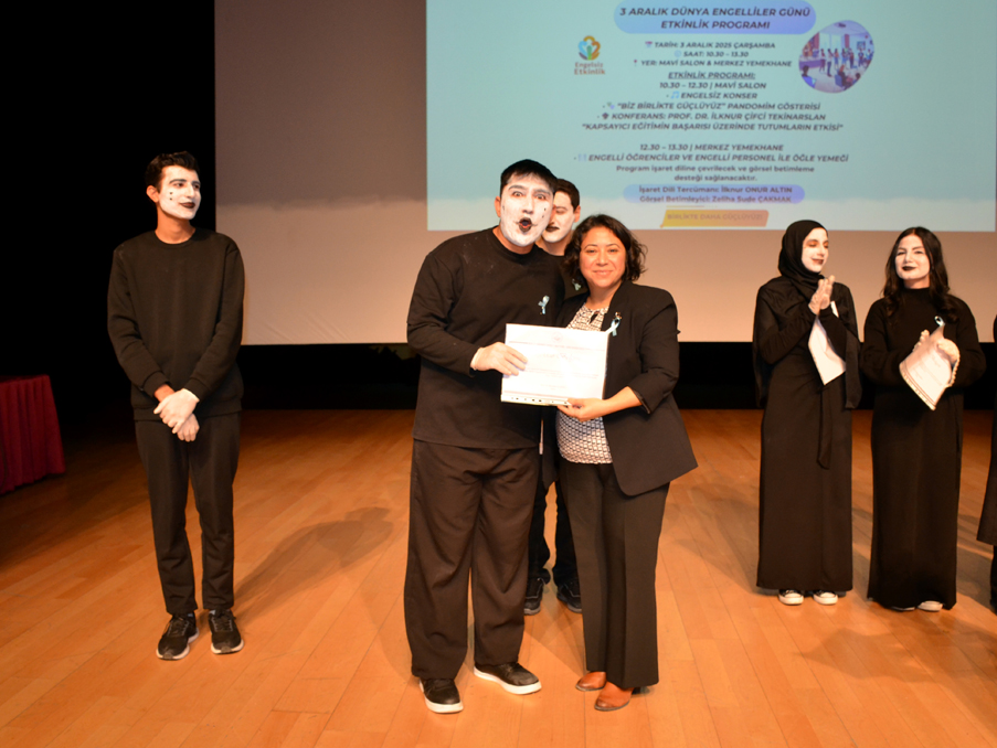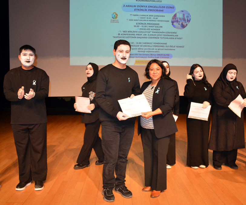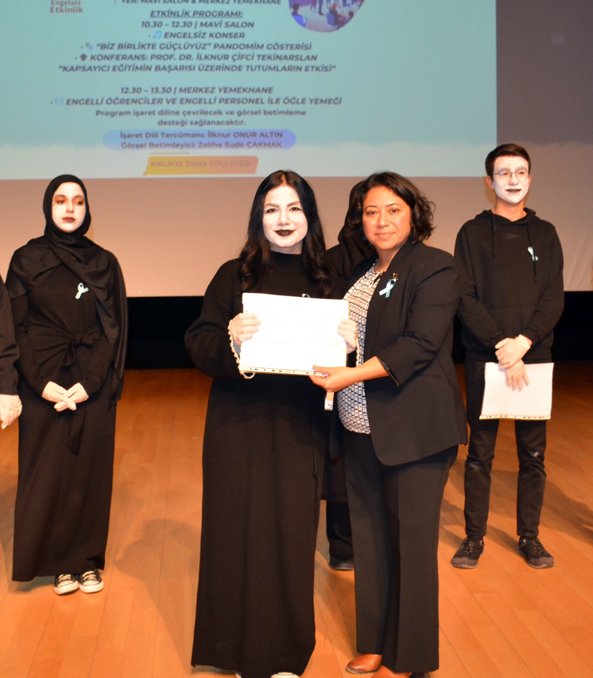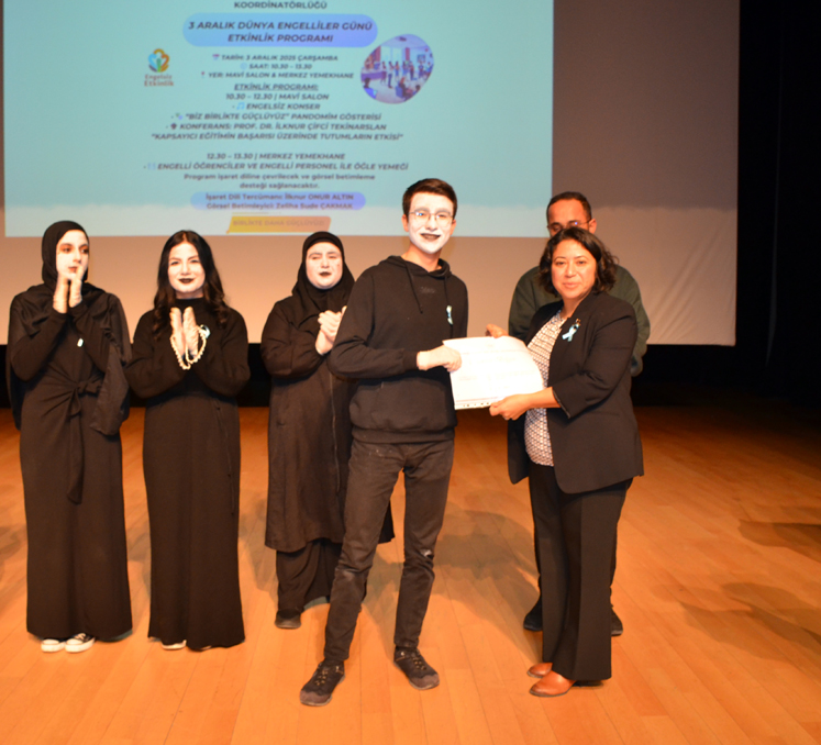 “Biz Birlikte Güçlüyüz” mesajını sessizliğin diliyle anlatan pandomim ekibinin gösterisi beğeni topladı. Ekip, engelli bireylerin günlük yaşamda karşılaştığı zorluk ve zorbalıkları, çözüm yolları ile birlikte, sanatın evrensel dilini kullanarak izleyiciye aktardı.