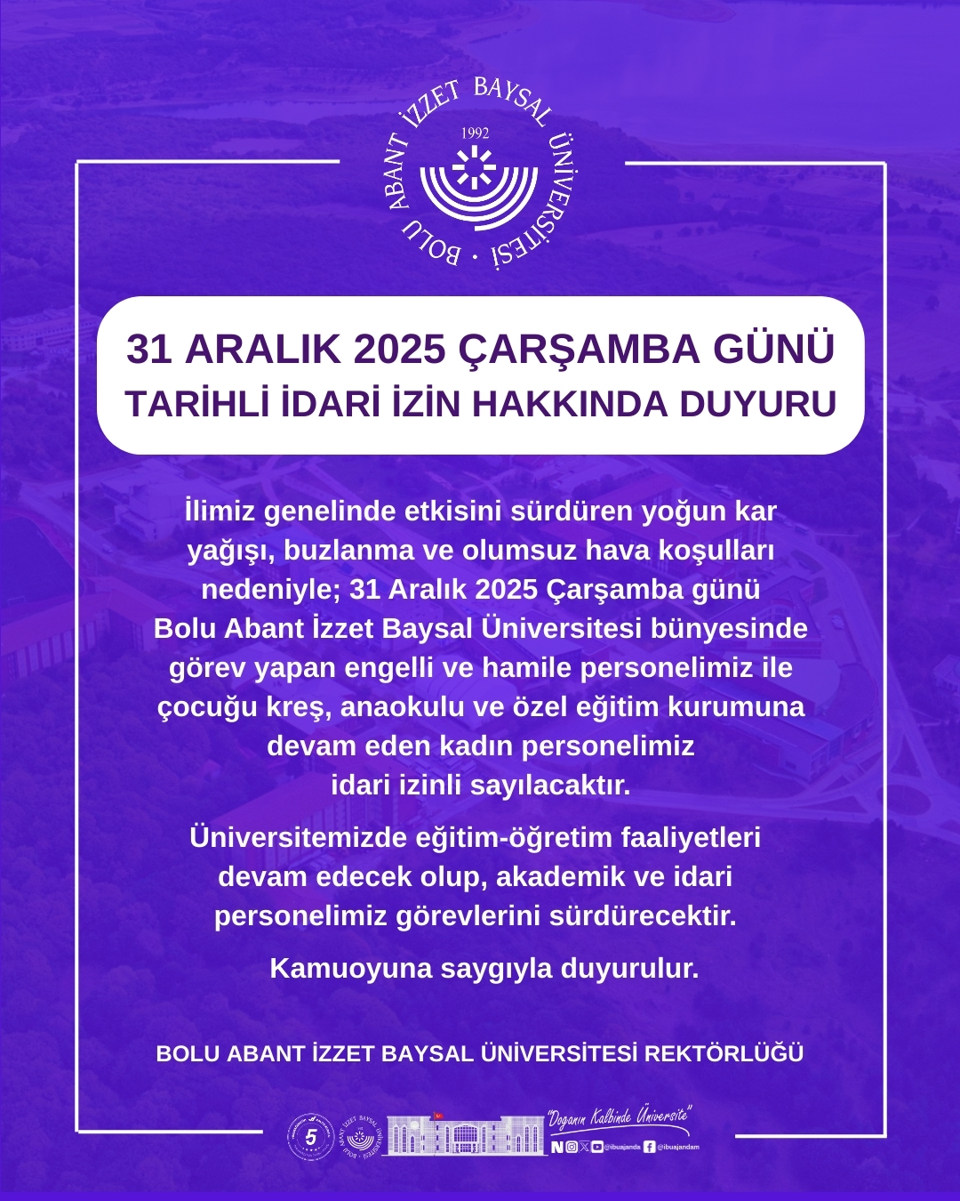 İlimiz genelinde etkisini sürdüren yoğun kar yağışı, buzlanma ve olumsuz hava koşulları nedeniyle; 31 Aralık 2025 Çarşamba günü Bolu Abant İzzet Baysal Üniversitesi bünyesinde görev yapan: Engelli ve hamile personelimiz, Çocuğu kreş, anaokulu veya özel eğitim kurumuna devam eden kadın personelimiz,Engelli öğrencilerimiz, 1(bir) gün süreyle idari izinli sayılacaktır.