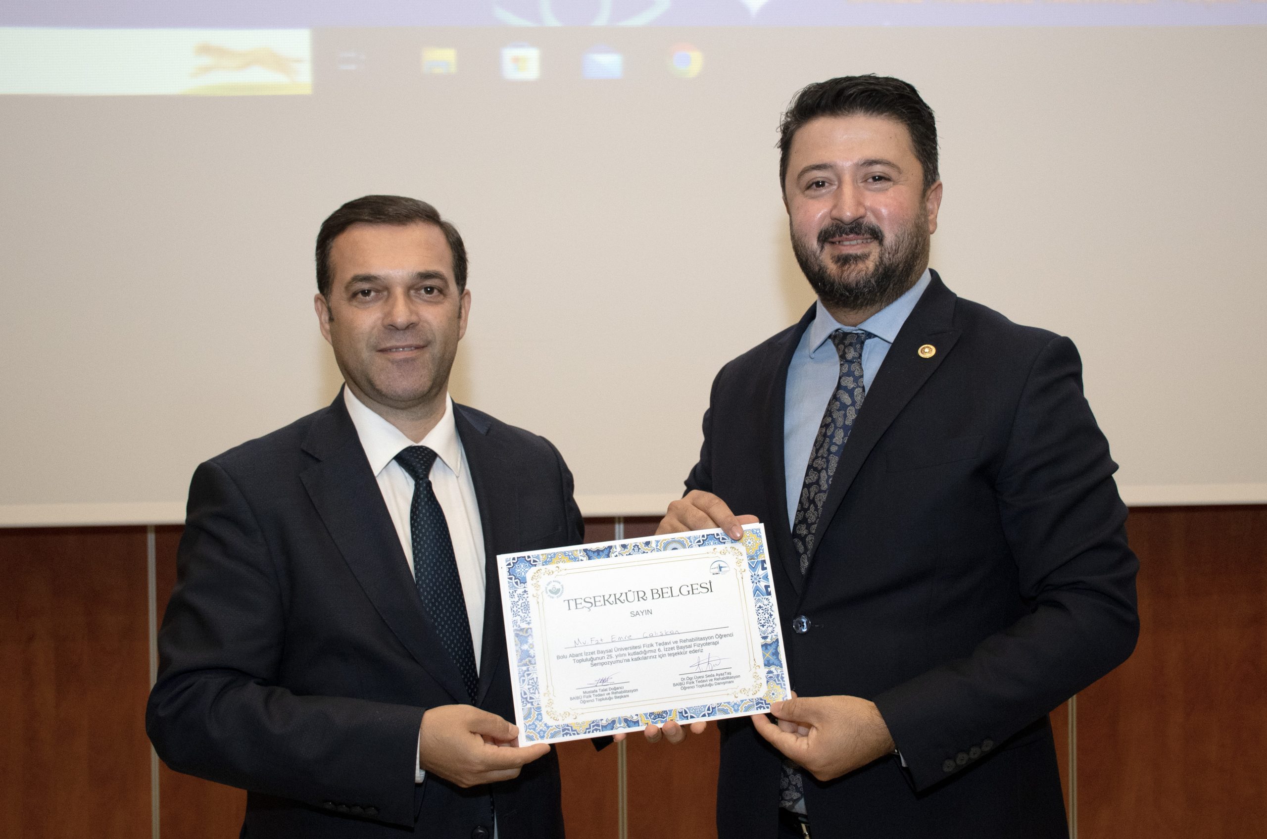 Soru cevap bölümünün ardından Nevşehir Milletvekili Emre Çalışkan’a Rektör Yardımcısı Prof. Dr. Aydın Him tarafından teşekkür belgesi verildi.