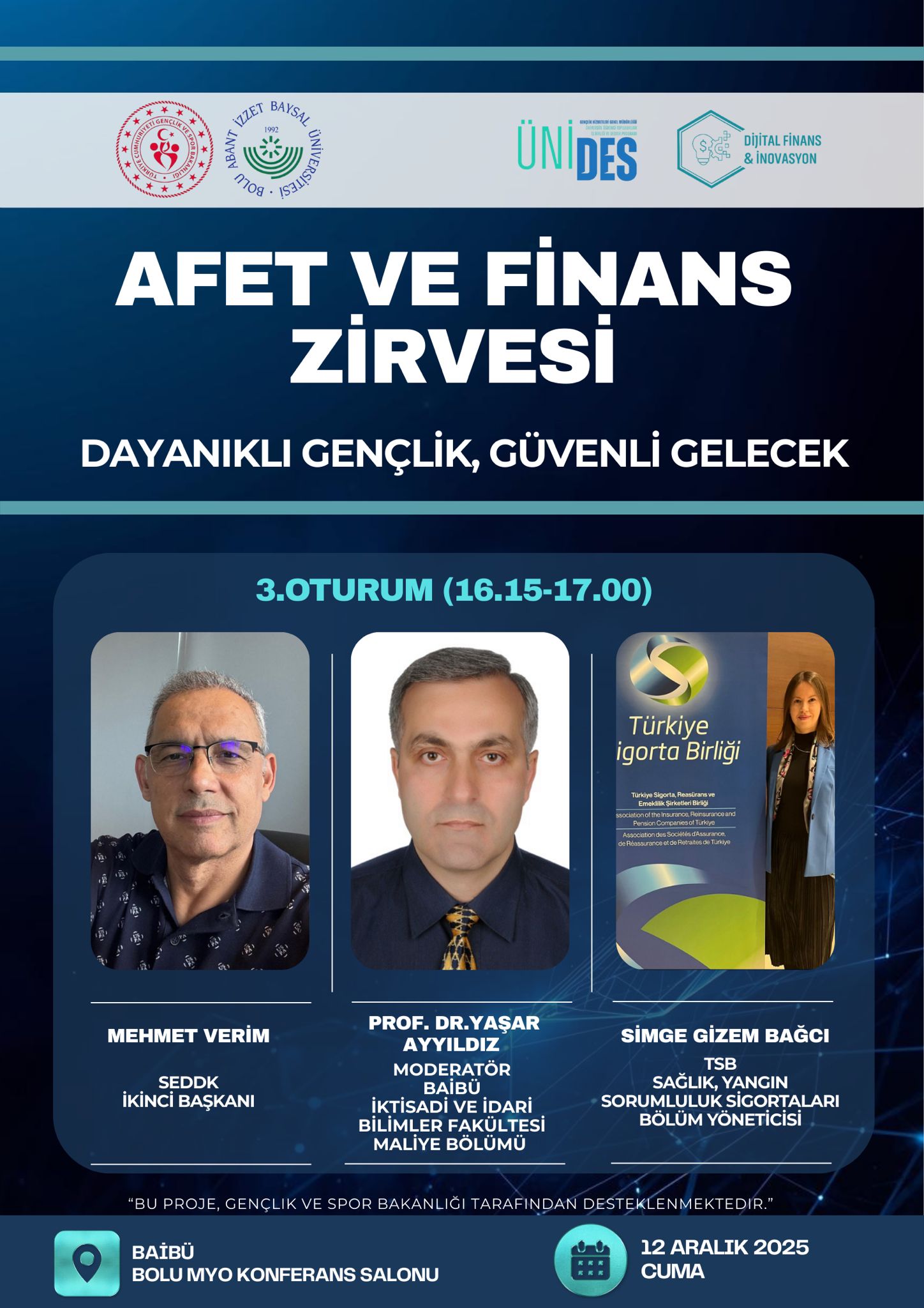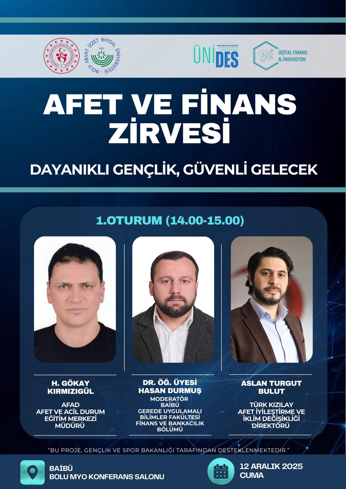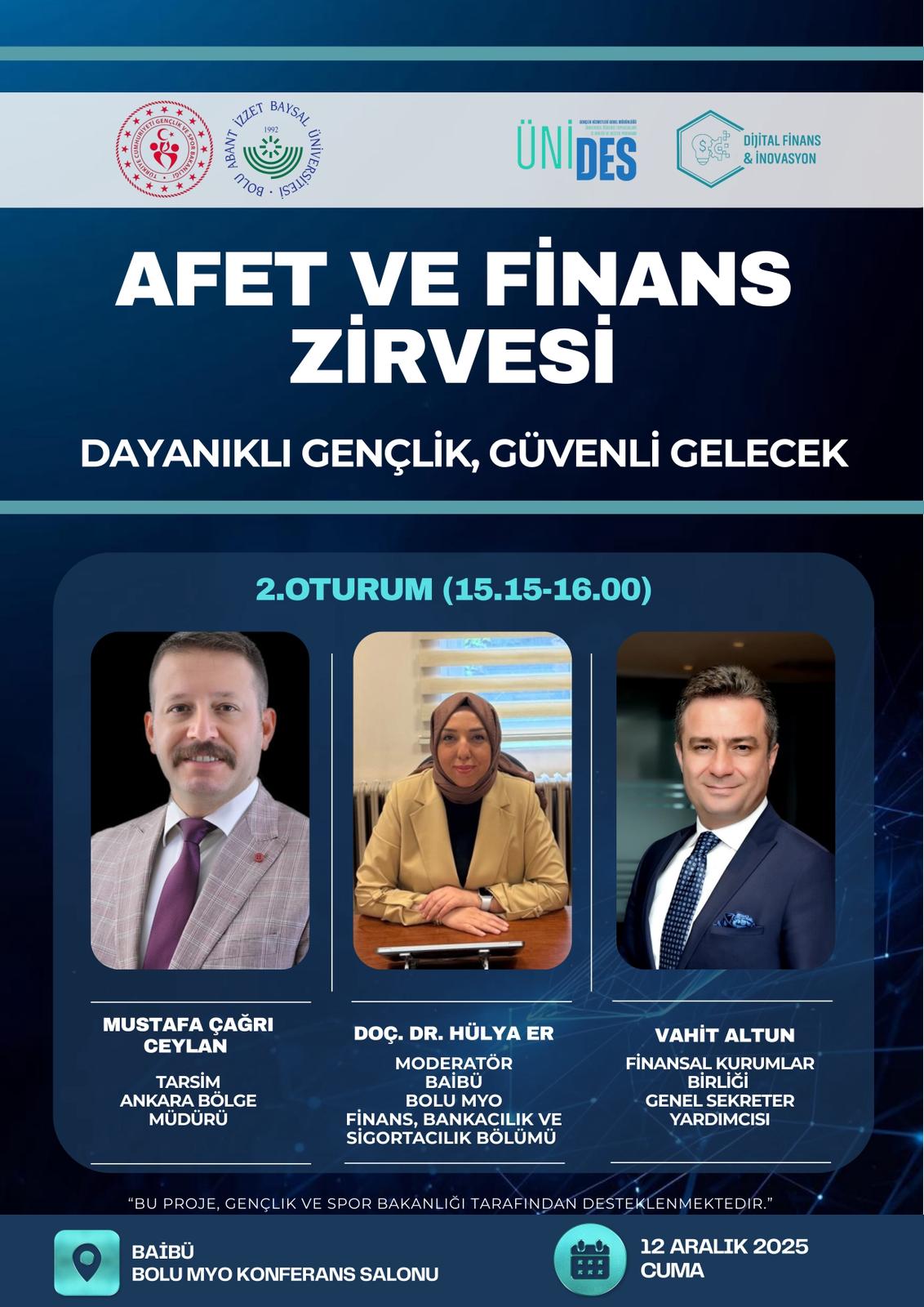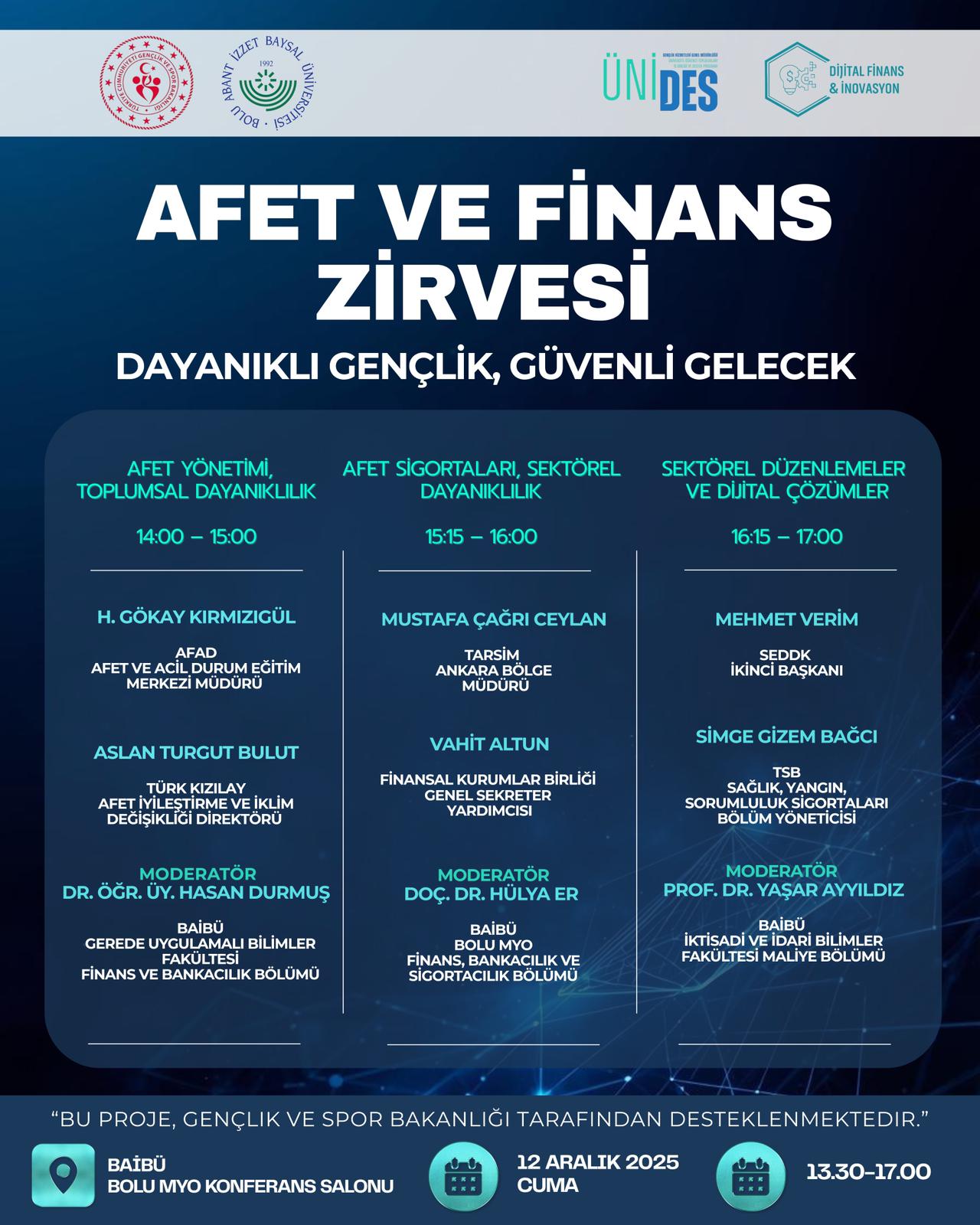 Bolu Abant İzzet Baysal Üniversitesi Bolu Meslek Yüksekokulu Finans, Bankacılık ve Sigortacılık Bölümü öğrencileri tarafından kurulan Dijital Finans ve İnovasyon Topluluğu öncülüğünde ve Gençlik ve Spor Bakanlığı ÜNİDES Programı kapsamında desteklenen “Afet ve Finans Zirvesi: Dayanıklı Gençlik, Güvenli Gelecek”, 12 Aralık 2025 Cuma günü gerçekleştirilecektir.