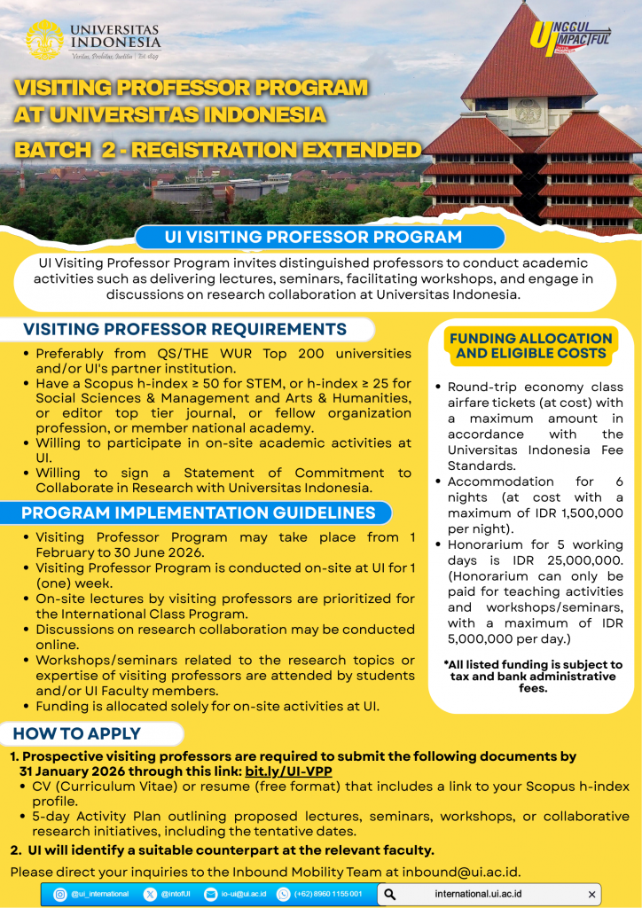 Endonezya’daki stratejik ortağımız Universitas Indonesia (UI) tarafından yürütülen UI Visiting Professor Programı (2. Dönem) başvurularının son tarihi 31 Ocak 2026 tarihine kadar uzatılmıştır.