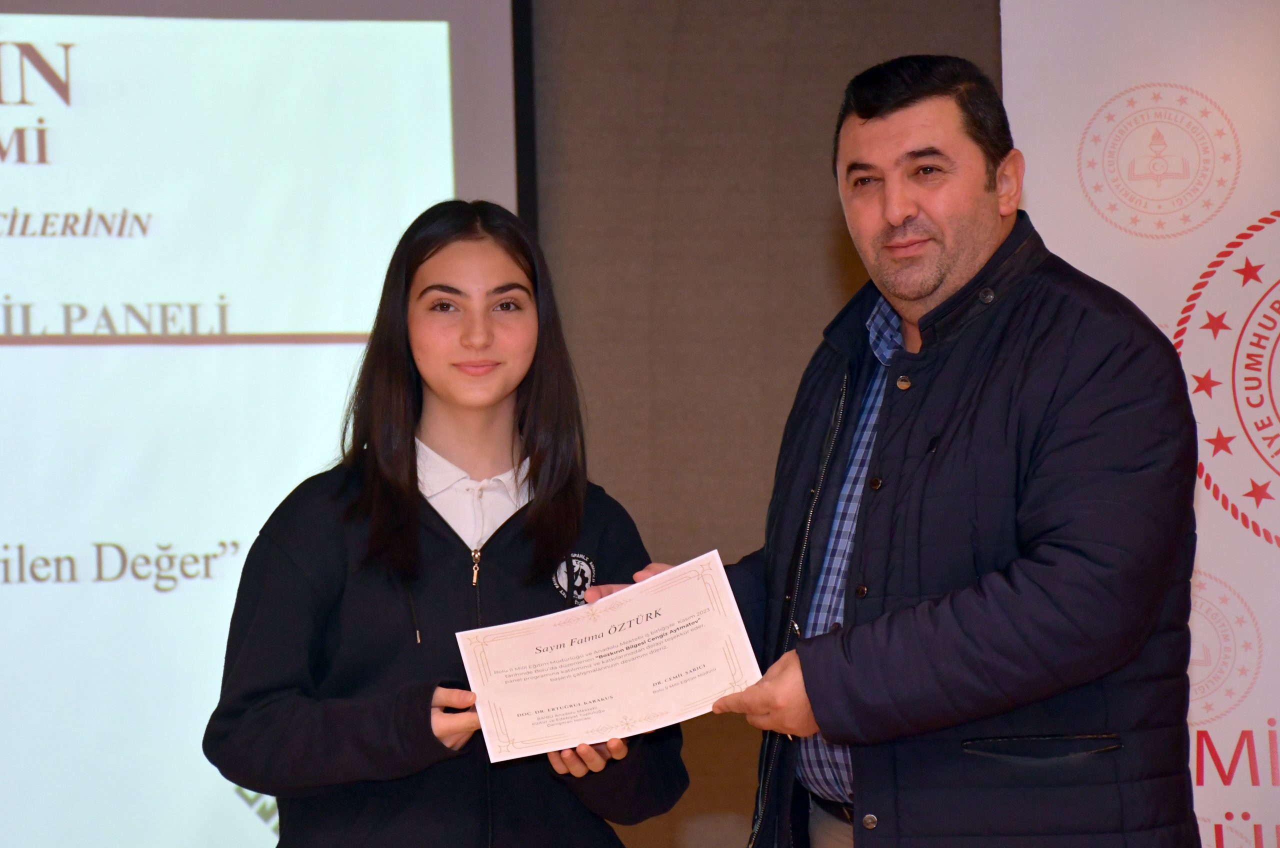 Mengen Ahmet Kahraman Çok Programlı Anadolu Lisesi öğrencisi Fatma Öztürk ise, “Aytmatov ve Kadın” konulu sunum yaptı. Eserlerinde kadını ön plana koyan yazarlardan birinin Aytmatov olduğunu vurgulayan Öztürk, “Aytmatov, tarihi savaş ve çeşitli mücadelelerle geçen Kırgızlar’da, kadını büyük sorumluluklar üstlenen varlıklar olarak betimlemiştir. Kırgız kadınlarının 2. Dünya Savaşında göstermiş oldukları mücadeleleri, çekmiş oldukları çileleri en sade ve güzel şekilde bizlere yansıtmıştır. Aytmatov’un eserlerinin merkezinde her zaman insan bulunmuştur. Fakat hayatın gidişatına yön veren karakterler her zaman kadınlar olmuştur.” dedi.