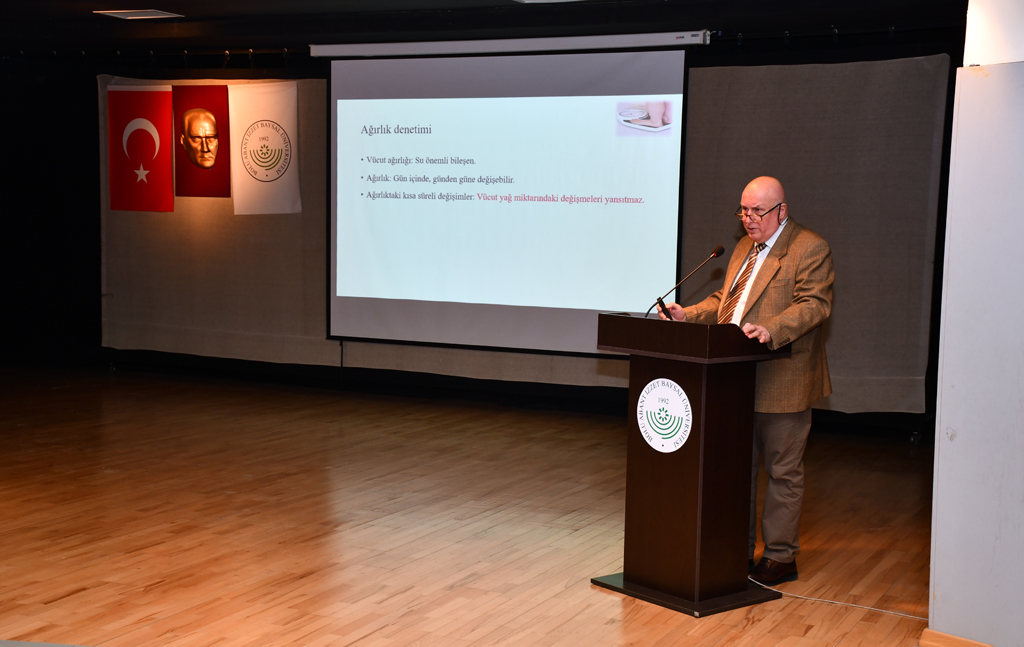 Beden kütle indeksinin nasıl hesaplanması gerektiğini, kadınlarda ve erkeklerde bel çevresi değerleri ve karın içi yağlanmasının zararları hakkında ayrıntılı bilgiler aktaran Prof. Dr. Tayfur, kilo ağırlığı denetiminin önemini vurguladı ve özetle “Vücut ağırlığında su önemli bir bileşendir. Ağırlık, gün içinde ve günden güne değişebilir. Ağırlıktaki kısa süreli değişimler, vücut yağ miktarındaki değişmeleri yansıtmaz.” dedi.