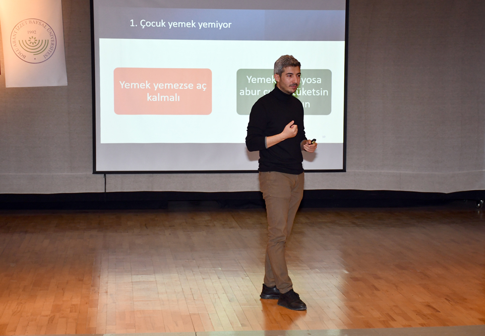 Sağlık Bilimleri Fakültesi Beslenme ve Diyetetik Bölümü Öğretim Üyesi Dr. Taha Gökmen Ülger ise “Çocuk Beslenmesinde Doğrular ve Yanlışlar” konulu sunum yaptı. Çocuk beslenmesinin neden önemli olduğunu anlatan Dr. Ülger, “Çocuk beslenmesi yalnızca ‘karnı doysun’ diye değil, sağlıklı, mutlu ve güçlü bireyler yetiştirmek için büyük önem taşır. Çocuklarda açlık ve tokluk duygusu doğuştan vardır. Ancak baskı, ceza veya aç bırakma gibi uygulamalar, bu doğal dengeyi bozar. Çocuk ne zaman acıktığını ve ne zaman doyduğunu fark edemez hale gelebilir. Eğer çocuk bir öğünde yeterince yemediyse, yemek yemeye zorlanmamalıdır. Sürekli atıştırmalık sunmak ya da sevdiği ama besleyici olmayan yiyeceklerle açığını kapatmaya çalışmak doğru değildir. Bu durumlarda sabırlı olmak, zorlamamak ve çocuğun iştahını baskı ile değil, güvenli bir beslenme ortamı ile desteklemek, en sağlıklı yaklaşımdır.” ifadelerini kullandı.