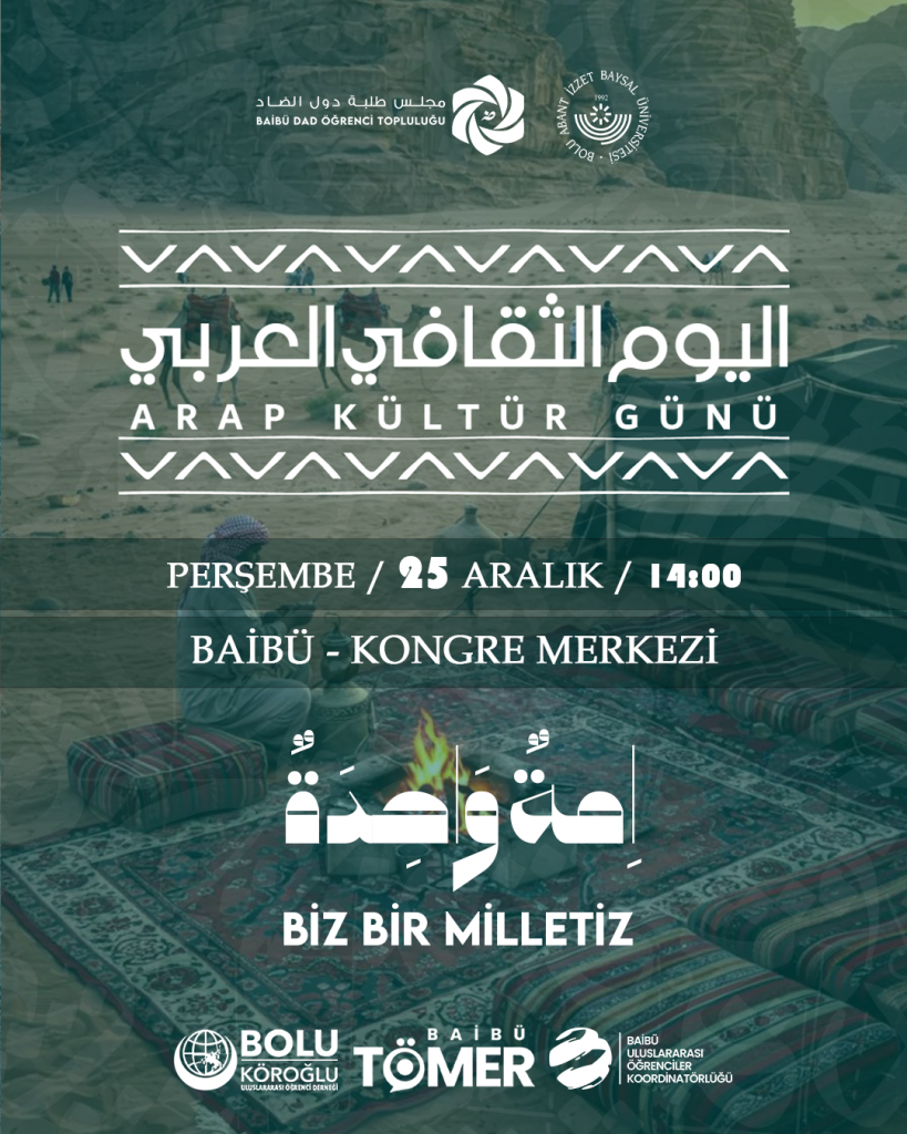 Üniversitemiz DAD Öğrenci Topluluğu tarafından Arap kültürünü daha yakından tanıtmak amacıyla “Arap Kültür Günü” etkinliği düzenlenecek olup tüm akademik ve idari personelimiz ile öğrencilerimiz etkinliğe davetlidir.