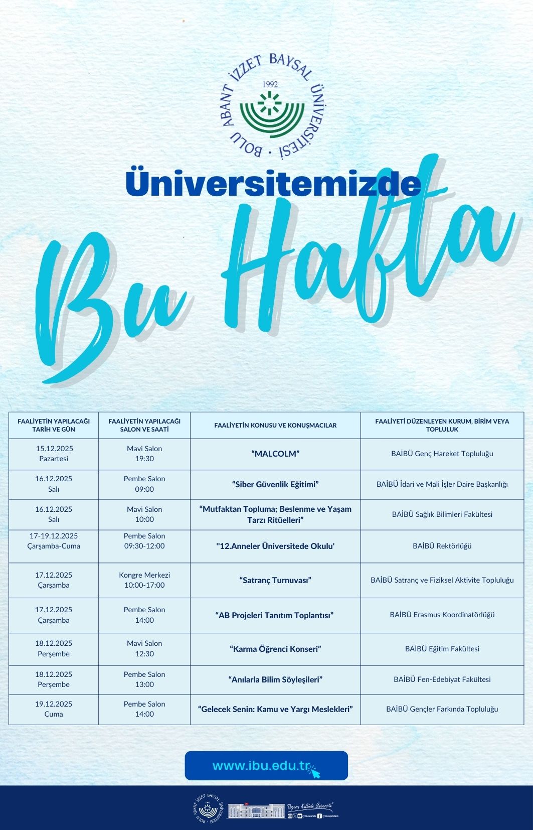 BAİBÜ Kültür ve Kongre Merkezi’nde Bu Hafta 17 Kasım 2025 Haftalık-Aylık-Yıllık Etkinlik Takvimi için : Tıklayınız Mevcut makalenin kısa URL'si : https://ajanda.ibu.edu.tr/5mn4