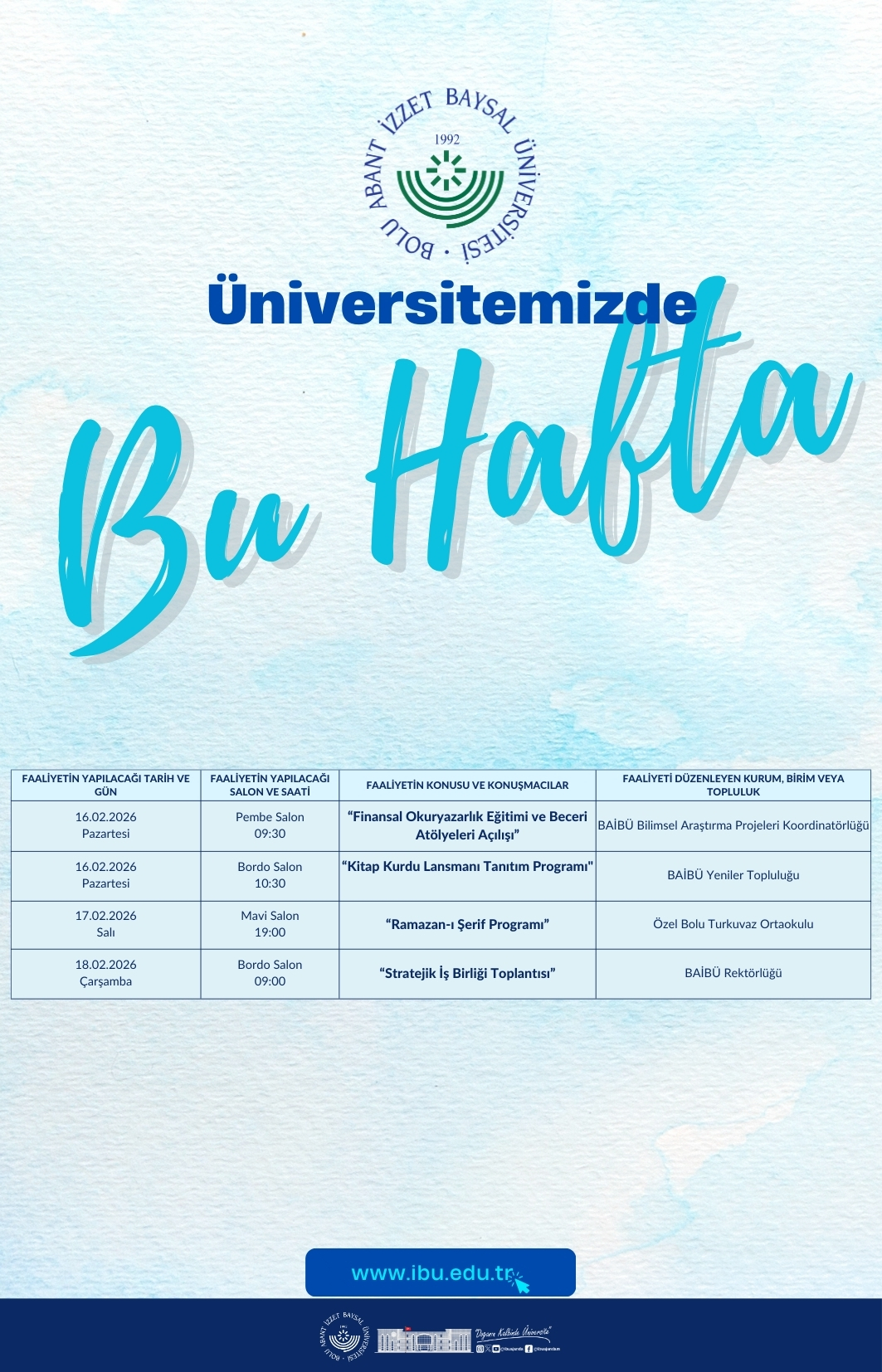 BAİBÜ Kültür ve Kongre Merkezi’nde Bu Hafta 10 Şubat 2026 Haftalık-Aylık-Yıllık Etkinlik Takvimi için : Tıklayınız Mevcut makalenin kısa URL'si : https://ajanda.ibu.edu.tr/5mn4