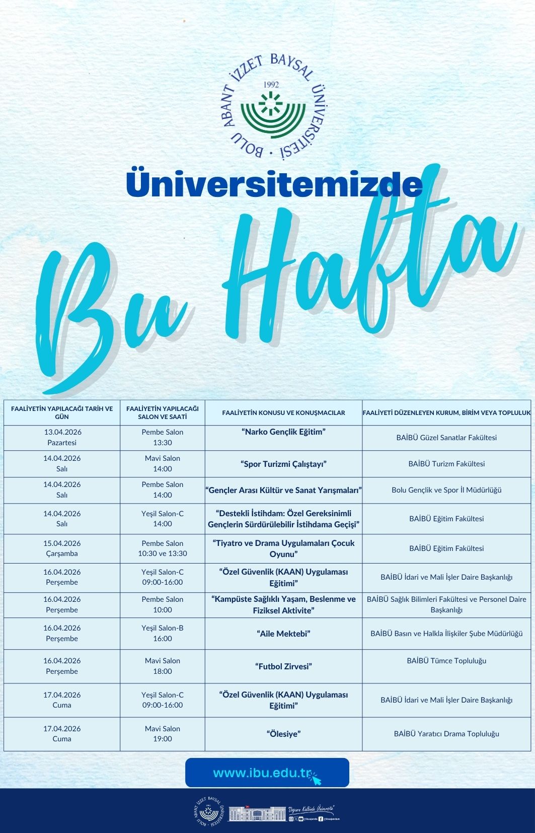 BAİBÜ Kültür ve Kongre Merkezi’nde Bu Hafta 06 Nisan 2026 Mevcut makalenin kısa URL'si : https://ajanda.ibu.edu.tr/5mn4