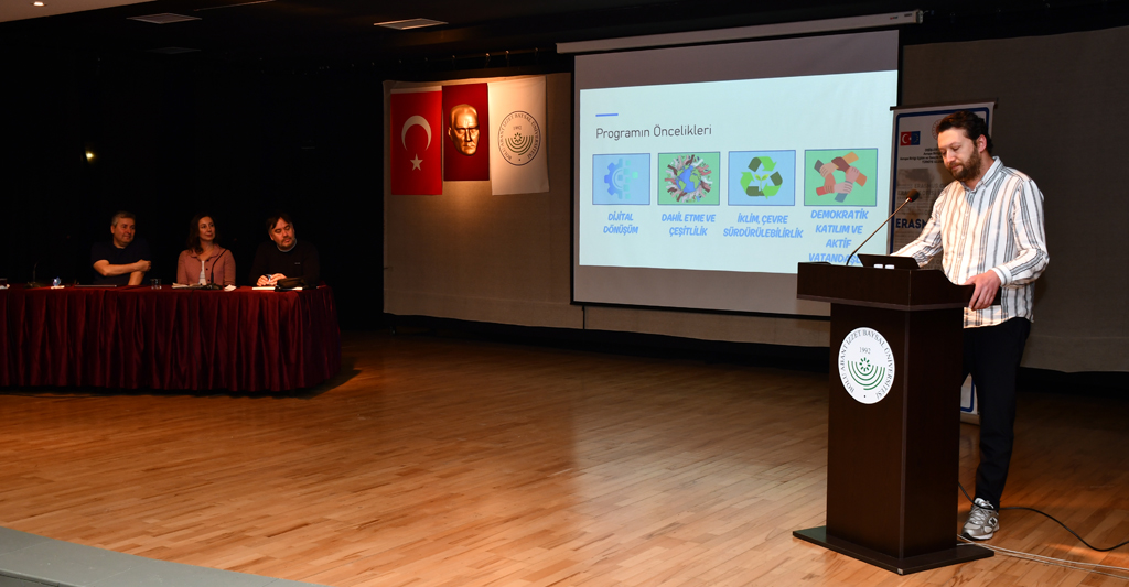 Toplantıda ilk olarak Dr. Öğr. Üyesi Orhan Curaoğlu, AB Projeleri Türleri ve Başvuru Şartları ile Horizon-MSCA ve İşbirliği Ortaklıkları konularına ilişkin “Erasmus+ Bireysel Yolculuktan Stratejik İnovasyona” başlıklı sunumunu gerçekleştirdi. Curaoğlu, Erasmus+ programlarının bireysel hareketlilikten başlayarak kurumsal ve uluslararası iş birliklerine uzanan yapısını ele aldı.