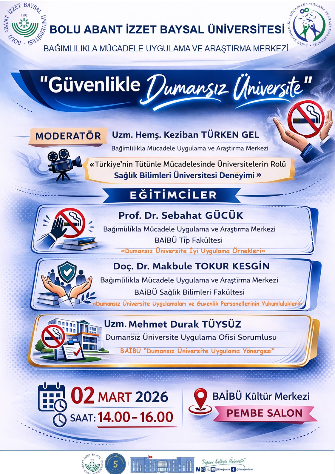 - Mehmet Durak Tüysüz ise “BAİBÜ Dumansız Üniversite Uygulama Yönergesi” çerçevesinde uygulama süreçlerine ilişkin değerlendirmeleriyle katkı sunacaktır.