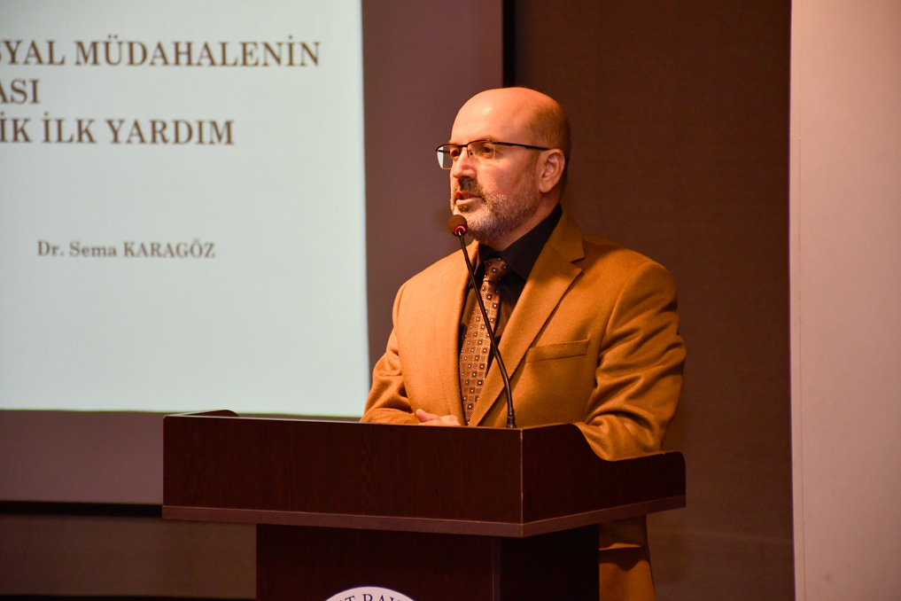 Dr. Öğr. Üyesi Sema Karagöz konuşmasına psikolojik ilk yardımın tanımını yaparak başladı. Psikolojik ilk yardımı herkesin yapabileceğini belirten Karagöz deprem felaketinin yaşandığı yerlerde karşılaşılabilecek durumları, deprem felaketinin yaşandığı yerlere gitmeden önce ve sonra neler yapılması gerektiğini anlattı. Felaketi yaşayan çocuklara yardım etmek için gelişim dönemlerine göre müdahale etmek gerektiğini vurgulayan Karagöz, psikolojik ilk yardımın nasıl sonlandırılabileceği hakkında örnekler vererek sözlerini bitirdi.