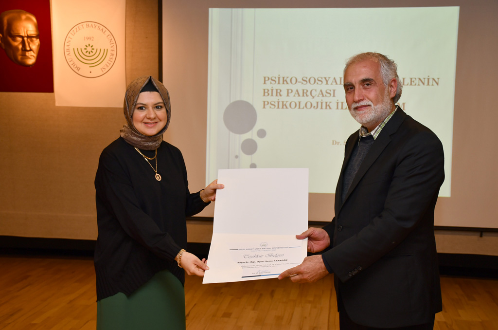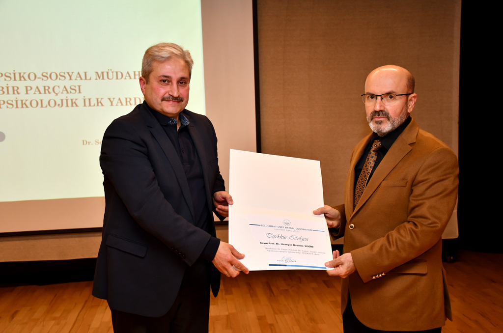 Konferans sonunda Karagöz ve Yeğin’e, Bolu İl Müftüsü Ali Rıza Tahiroğlu ve BAİBÜ İlahiyat Fakültesi Dekanı Prof. Dr. Bilal Gökkır tarafından teşekkür belgesi takdim edildi.