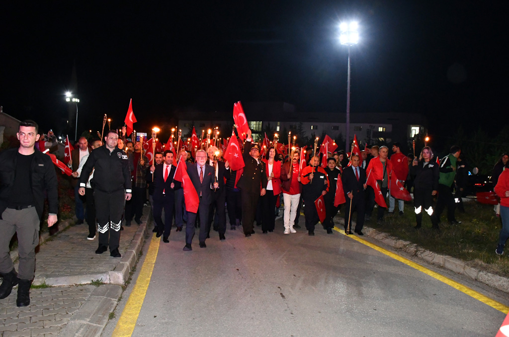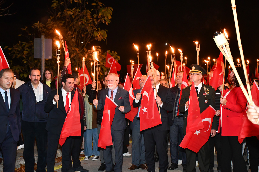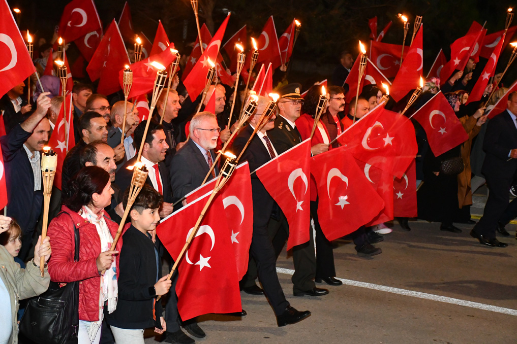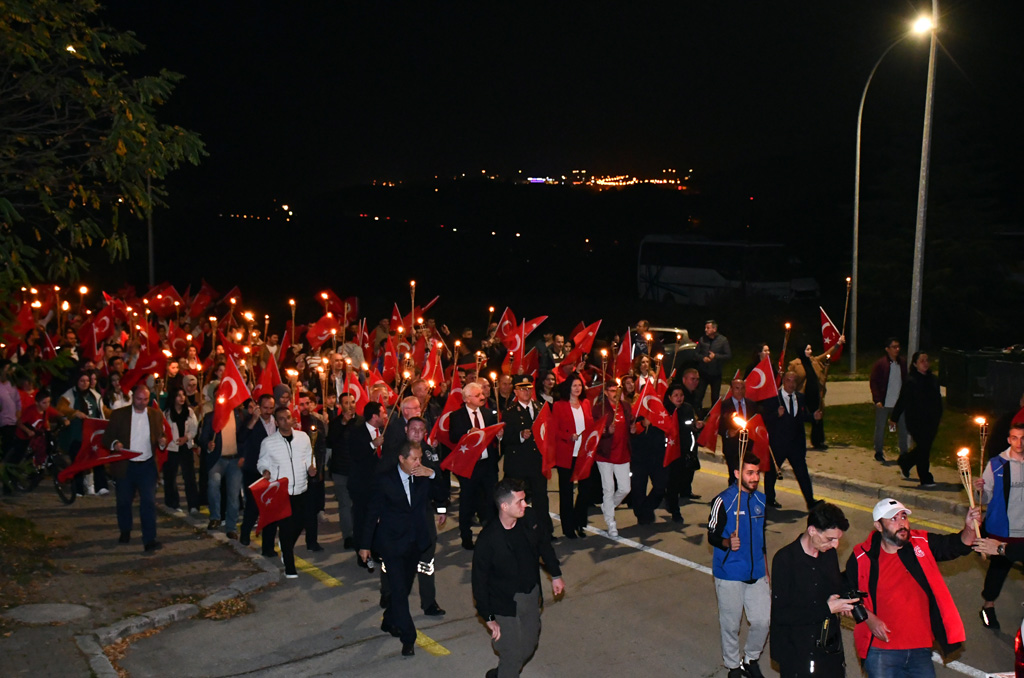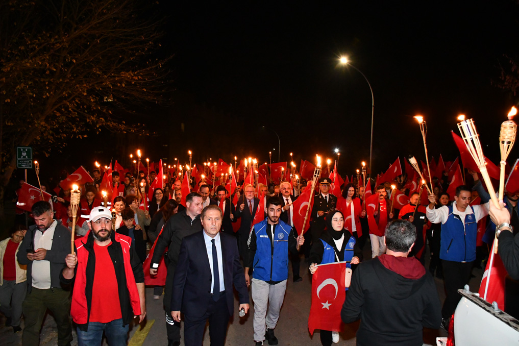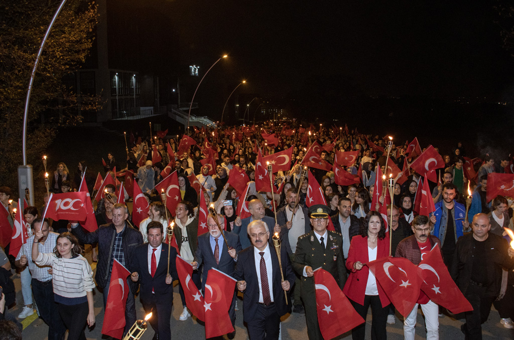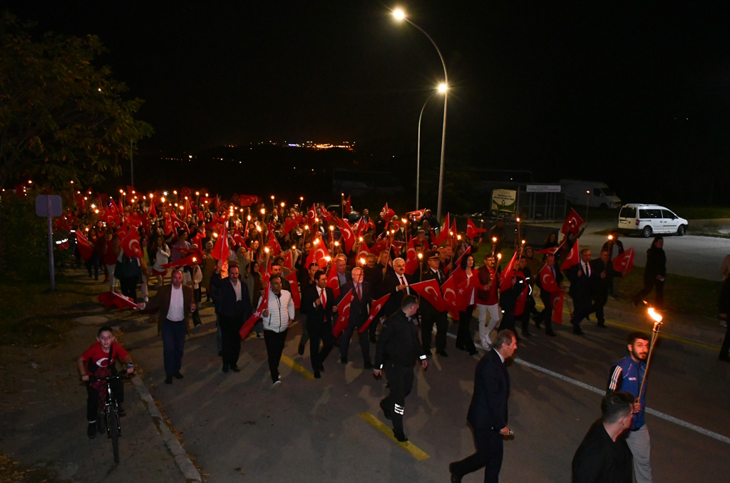 Bayraklarla ve meşalelerle metrelerce uzunlukta Cumhuriyetimizin yüzüncü yılının şanına yaraşır bir fener alayı oldu.