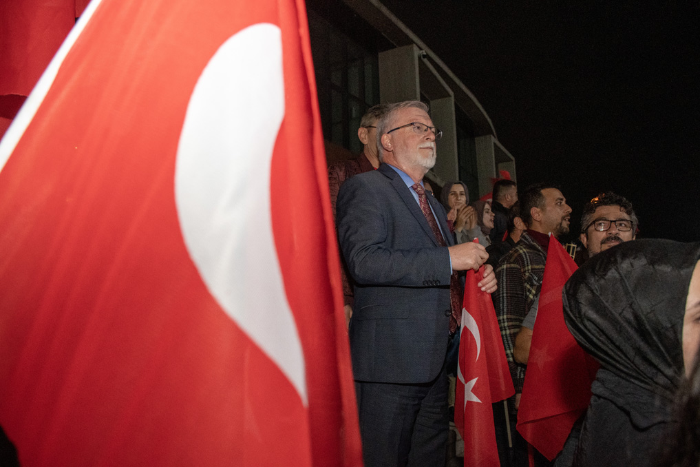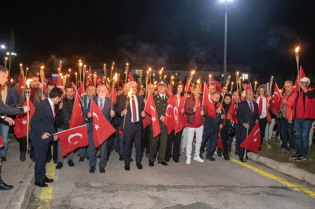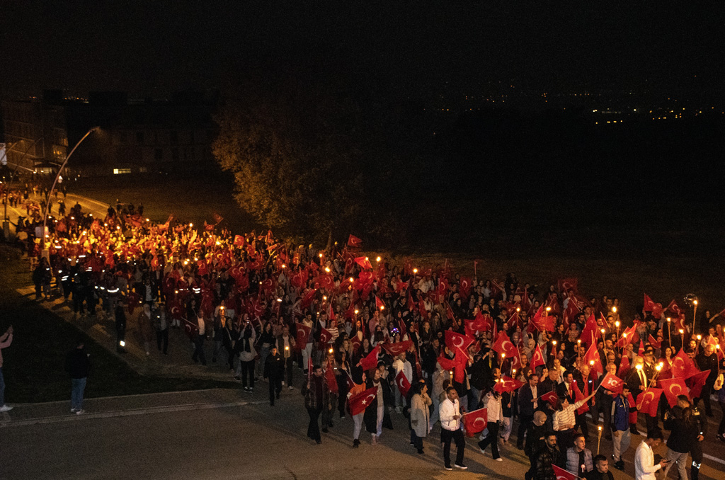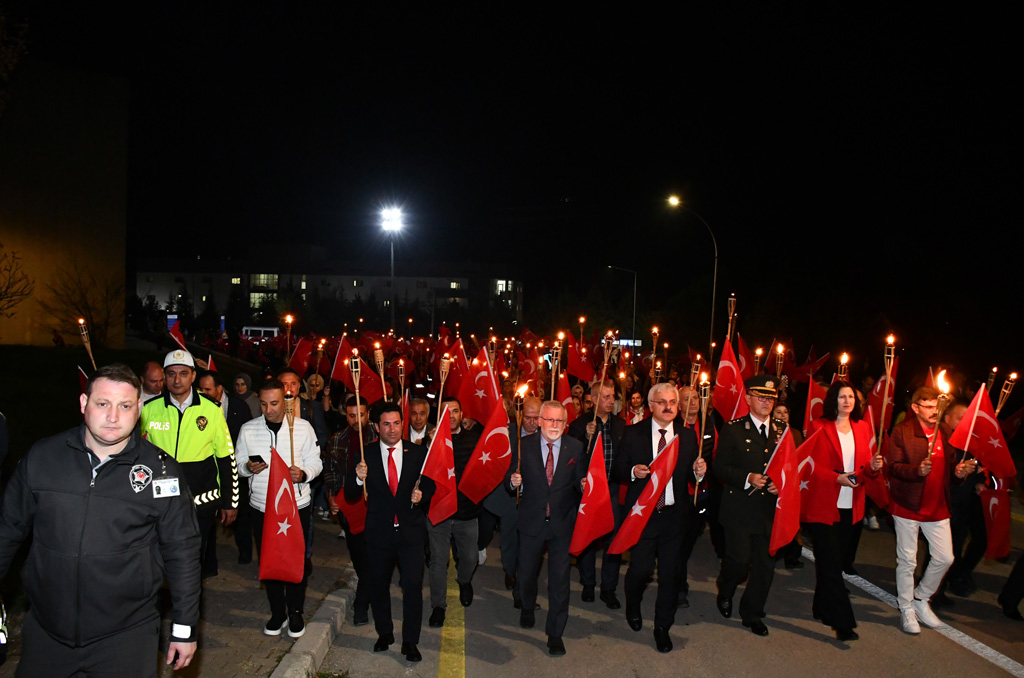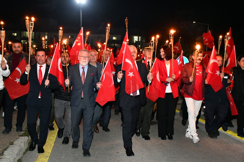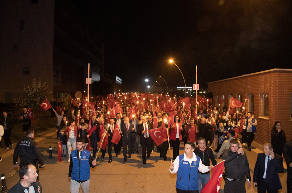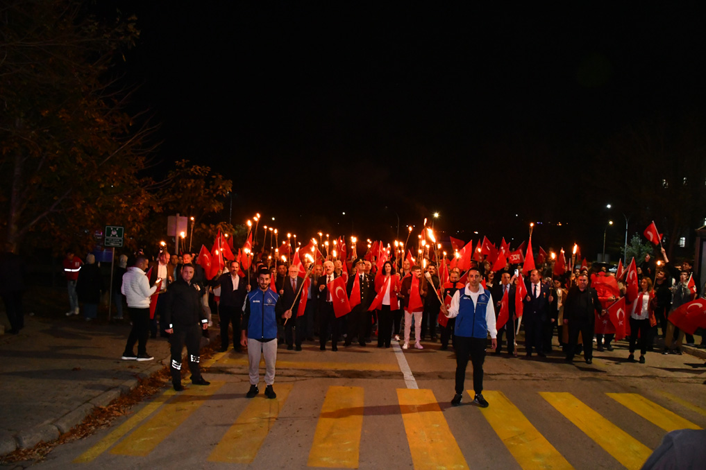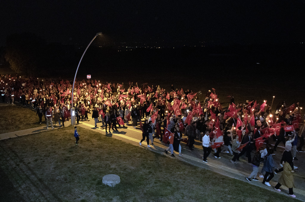 Bayraklarla ve meşalelerle metrelerce uzunlukta Cumhuriyetimizin yüzüncü yılının şanına yaraşır bir fener alayı oldu.