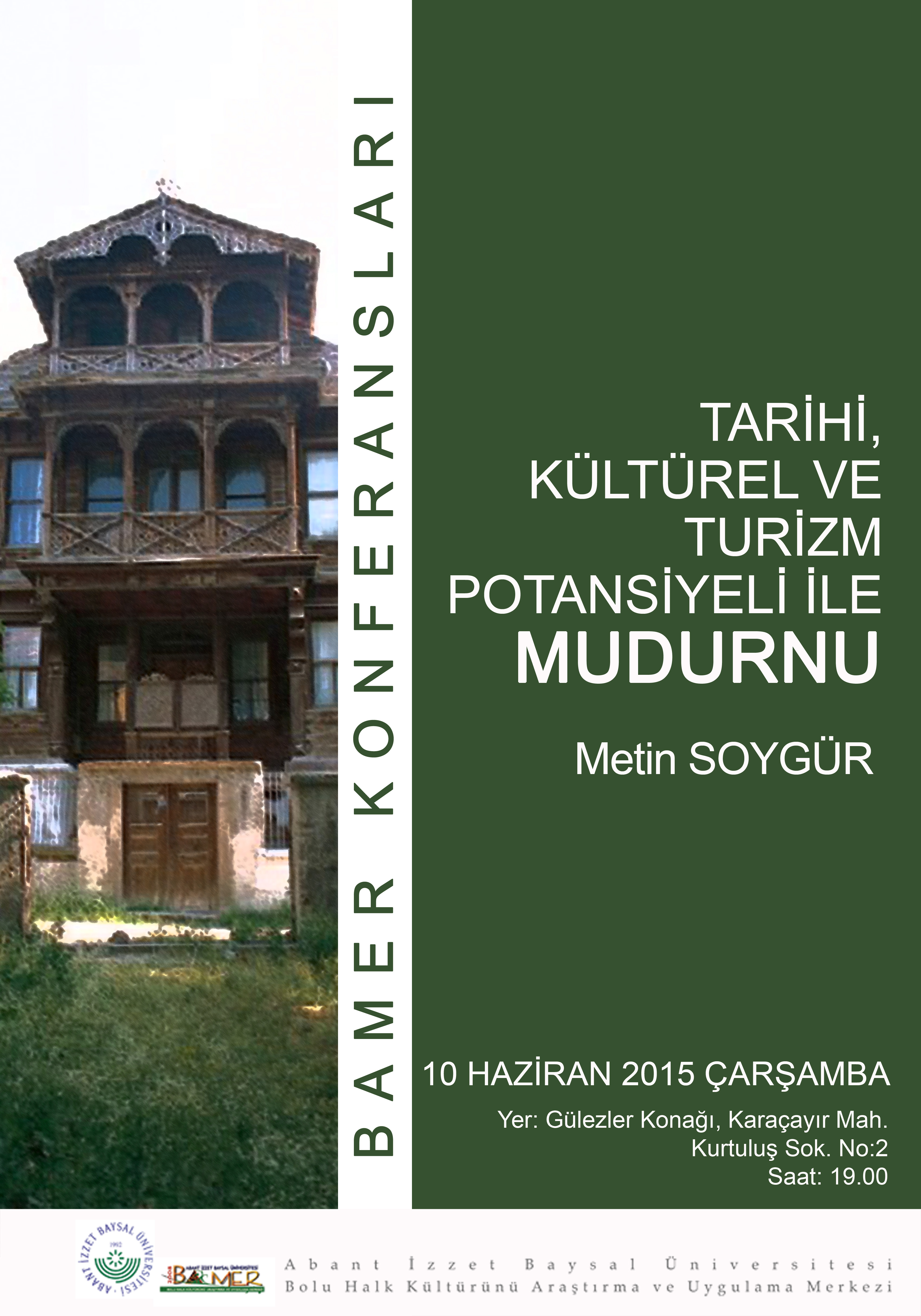 BAMER Konferansları 04 Haziran 2015 BAMER Konferansları Tarihi, Kültürel ve Turizm Potansiyeli ile Mudurnu Konuşmacı: Metin Soygür Tarih: 10 Haziran 2015 Çarşamba, Saat: 19.00 Yer: Gülezler Konağı