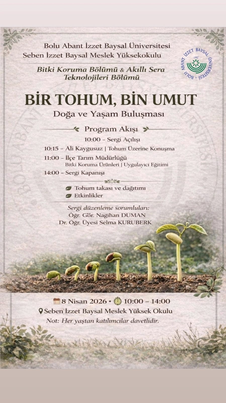 Üniversitemiz Seben İzzet Baysal Meslek Yüksekokulu bünyesinde faaliyet gösteren Bitki Koruma Bölümü ile Akıllı Sera Teknolojileri Bölümü tarafından düzenlenen “Bir Tohum, Bin Umut: Doğa ve Yaşam Buluşması” etkinliği, 8 Nisan 2026 Çarşamba günü gerçekleştirilecektir.