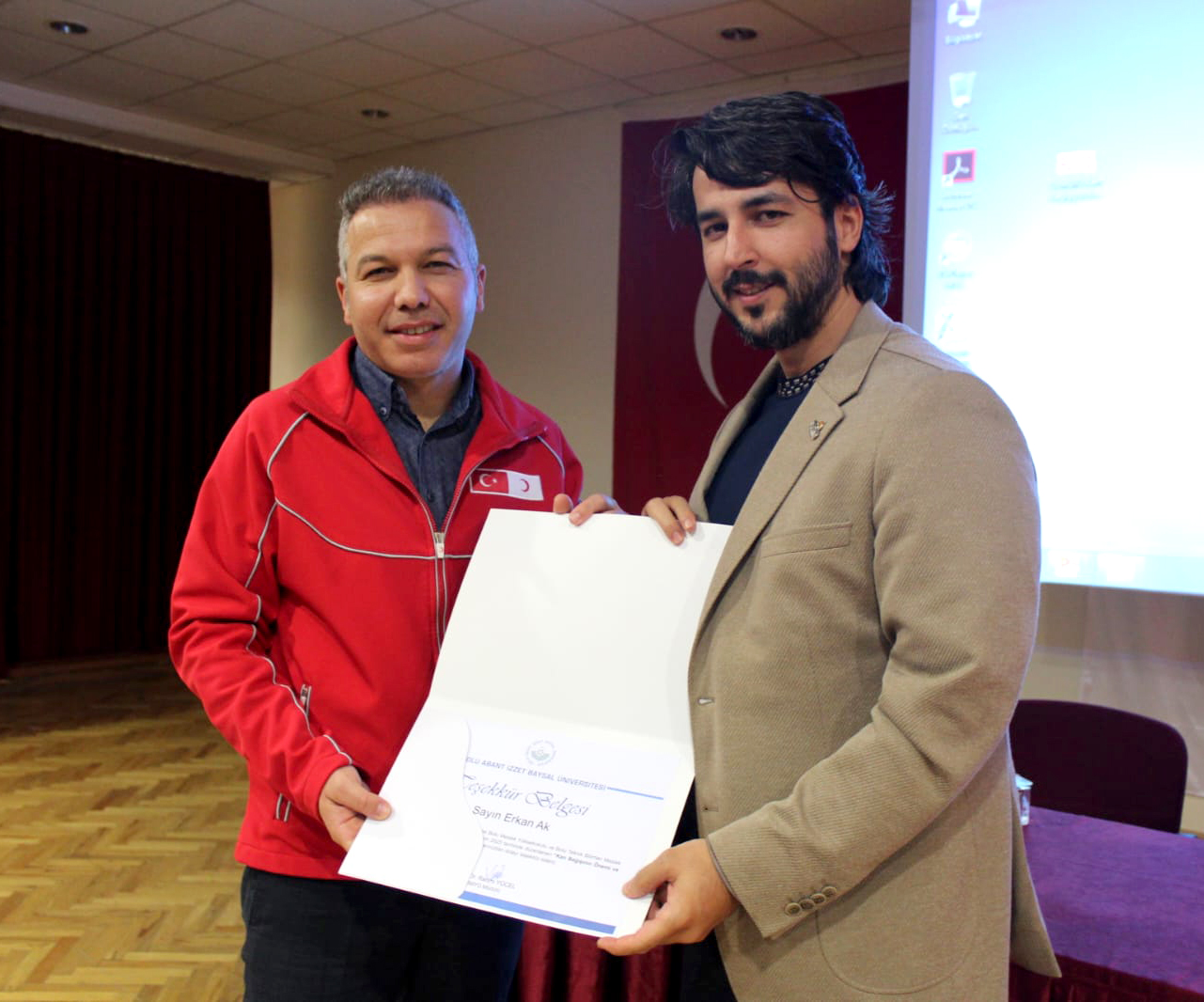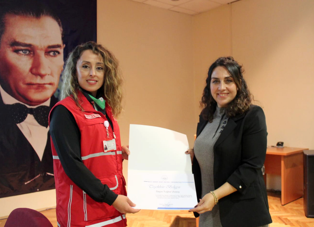 Etkinliğin sonunda, Öğr. Gör. Nezahat Dilekçi, katkılarından dolayı Kızılay Bolu Şube Başkan Yardımcısı Tuğba Ulusoy’a; Öğr. Gör. Hayreddin Özden ise Kızılay Kan Bağışı Kazanım Uzmanı Erkan Ak’a teşekkür belgelerini takdim etti.