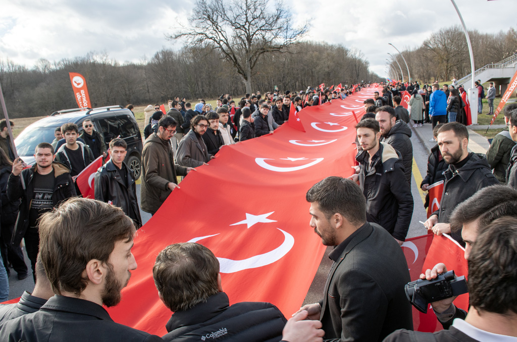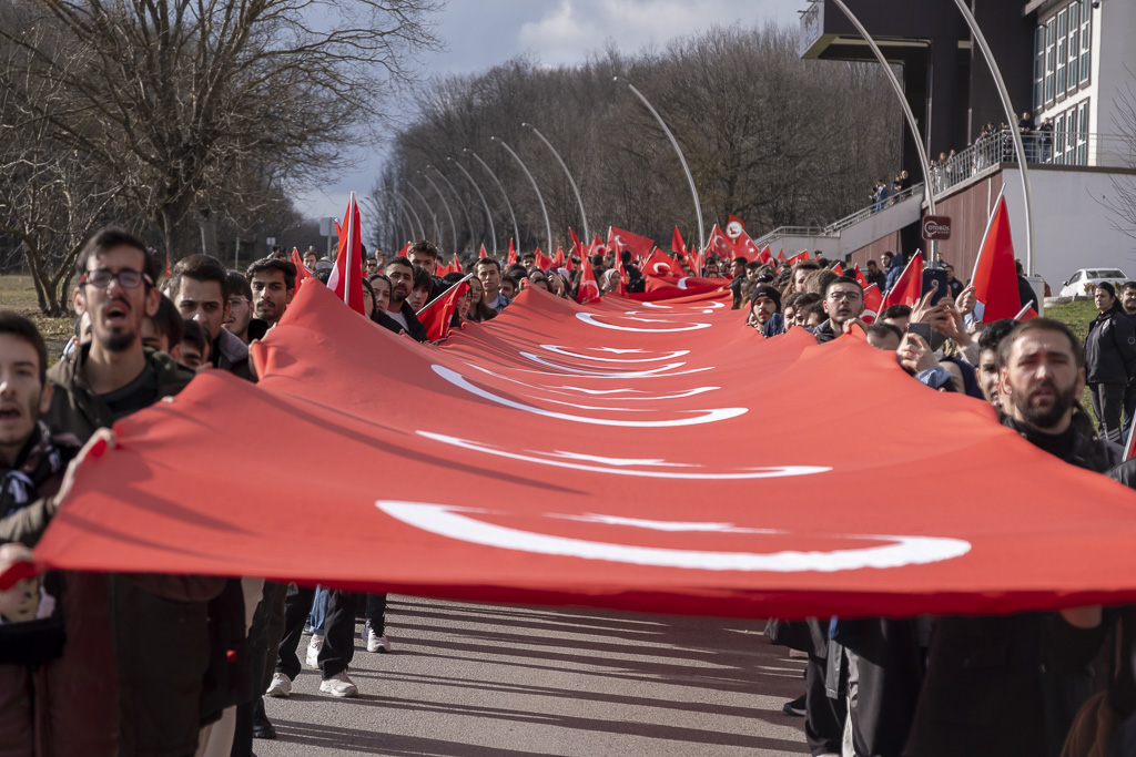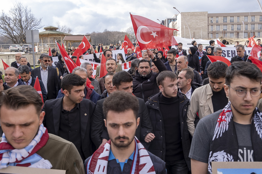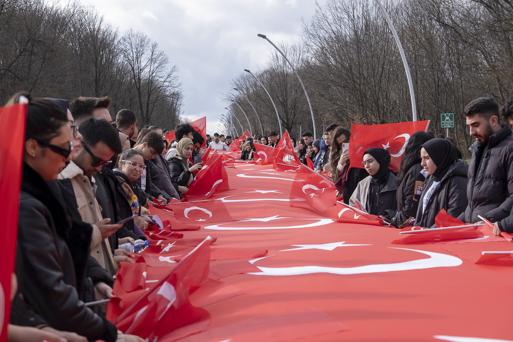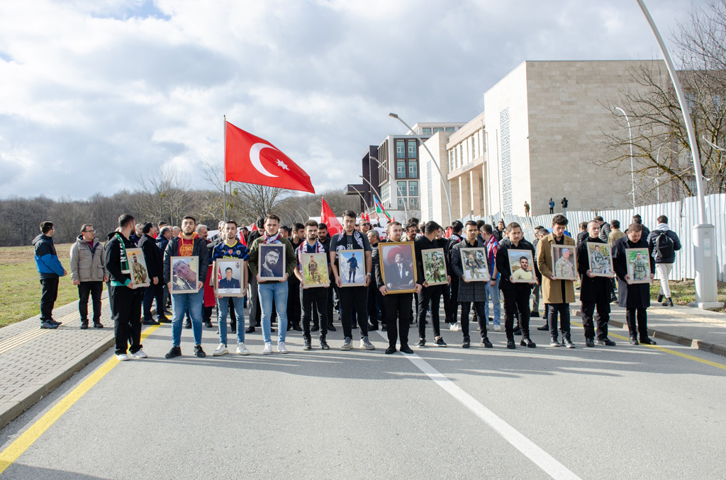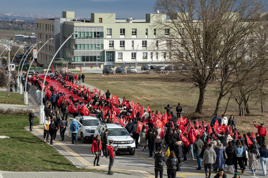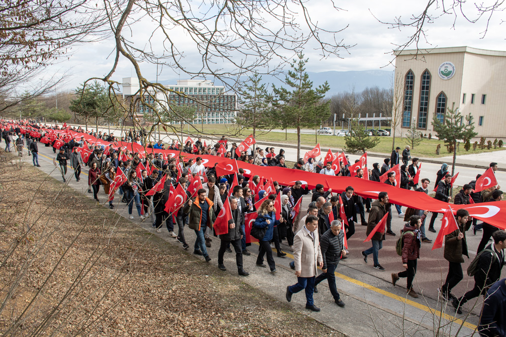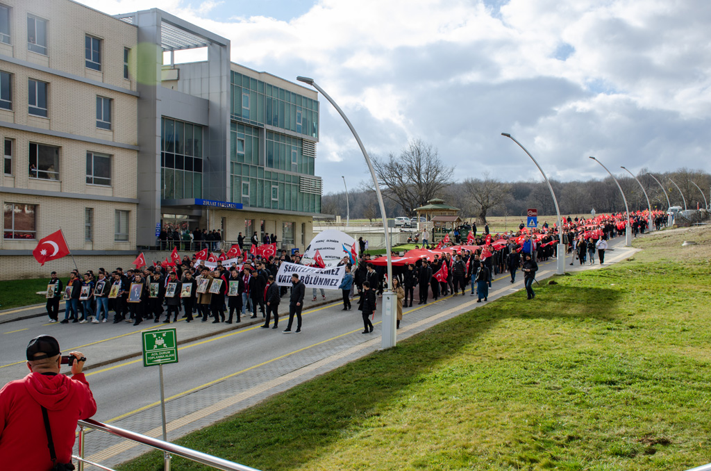 Yürüyüşe akademik ve idari personelin yanı sıra çok sayıda öğrenci katıldı. Prof. Dr. Fuat Sezgin Kütüphanesinin önünden başlayan yürüyüşe katılanlar teröre lanet okuyup şehitlerimizi rahmet, minnet ve şükranla andı.