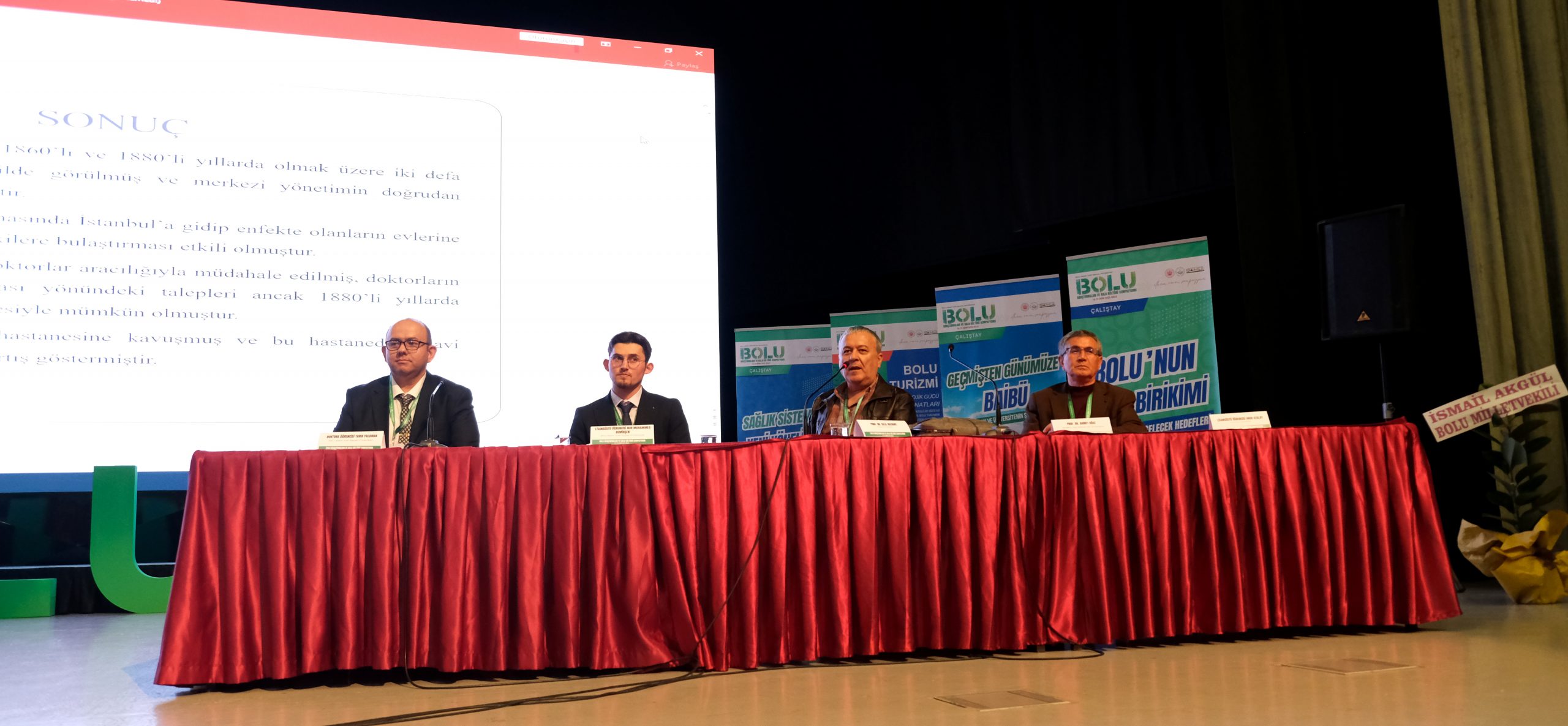 Kongre Merkezi Bordo Salonda 09.30-11.00 saatleri arasında moderatörlüğünü Prof. Dr. Mustafa Keskin’in yaptığı “Bolu’ya Dair Sosyolojik ve Felsefi Bir Bakış” başlıklı panel ve farklı salonlarda eş zamanlı 6 konferans düzenlendi; konferans ana başlıkları şunlardır:
