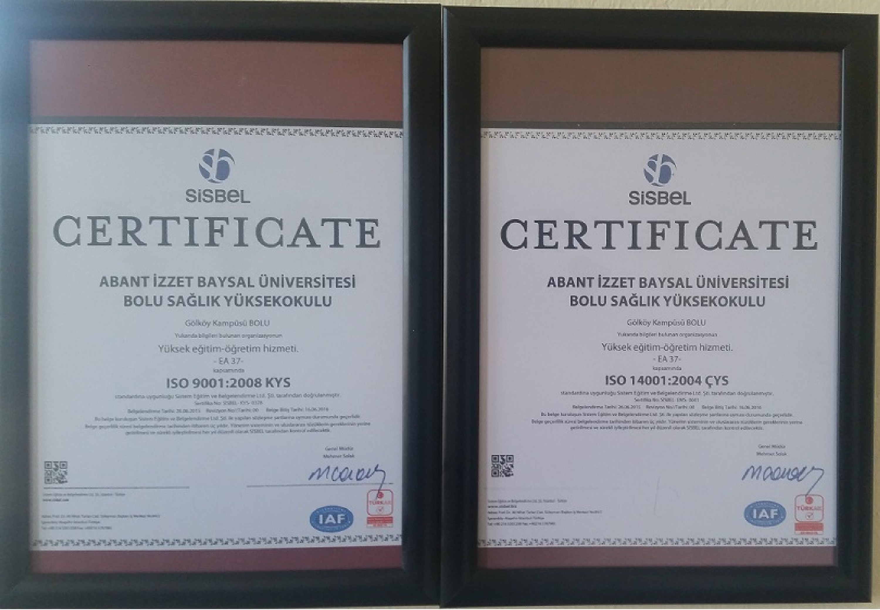 Kalite süreçlerinin başarıyla tamamlanmasından sonra Eğitim öğretim hizmetlerinde kalite belgesine sahip Abant İzzet Baysal Üniversitesi Bolu Sağlık Yüksekokulu, ISO 9001:2008 Kalite Yönetim Sistemi ile ISO 14001:2004 Çevre Yönetim Sistemi belgelerini yenilemeye hak kazandı.