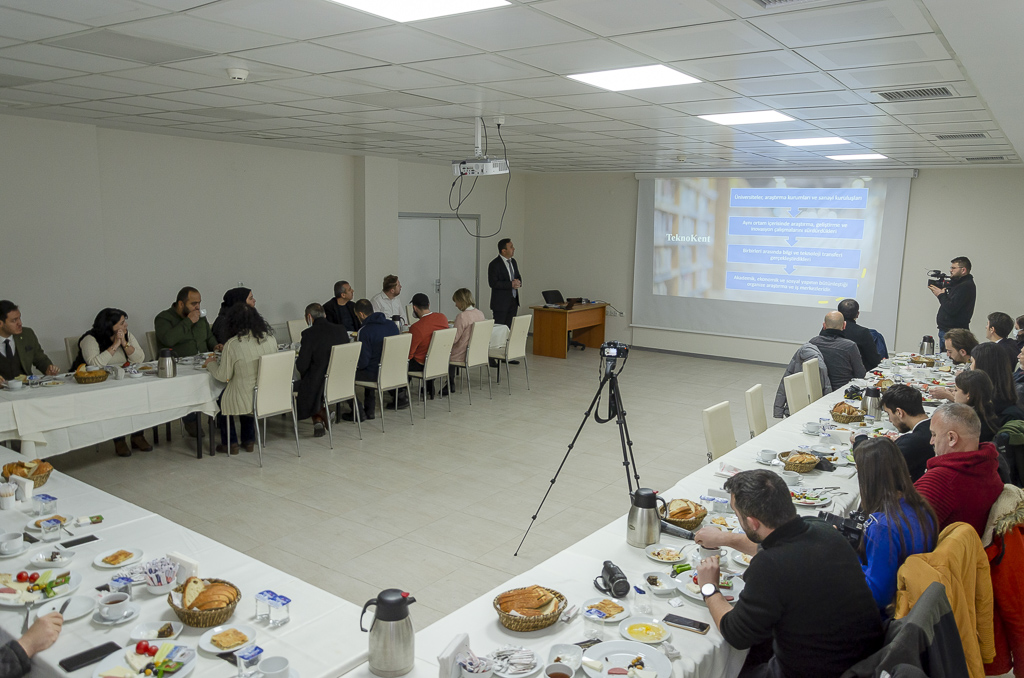 Toplantıda basın mensuplarına Bolu Teknokent hakkında sunum yapan Teknokent Genel Müdürü Prof. Dr. Mustafa İmren, Teknokentlerin, firmaların rekabet gücünü, inovasyon ve Ar-Ge faaliyetleri aracılığıyla ortaya koyan şirketler olduğunu kaydederek, “Teknokentler, temel amacı rekabet gücünü ve yenilik kültürünü geliştirmek suretiyle üyelerine değer artışı sağlayan ve profesyonel bir yönetici tarafından yönetilen şirket olarak isimlendiriliyor. 4691 sayılı Teknoloji Bölgeleri Geliştirme Kanununda Teknokentler, üniversiteler, araştırma kurumları ve sanayi kuruluşlarının, aynı ortam içerisinde araştırma, geliştirme ve inovasyon çalışmalarını sürdürdükleri, birbirleri arasında bilgi ve teknoloji transferi gerçekleştirdikleri ve akademik, ekonomik ve sosyal yapının bütünleştiği organize araştırma ve iş merkezleri olarak yer alıyor. Teknokent’te, üniversite ve araştırma kuruluşlarının özellikle alt yapılarının kullanılması, sanayi firmalarının sermaye sağlaması ve en önemlisi bu ortamda araştırma ve inovasyonun yapılması ve bunun ticarileştirilmesi, böylelikle Teknokent içindeki ve dışındaki paydaşların tamamına söz konusu inovasyon ve bilimsel çıktıların aktarılmasının sağlanması amaçlanıyor. En önemlisi de, sosyal yapıyla yani şehirle bütünleşmiş bir Teknokent ile bulunduğu bölgenin ihtiyaçlarını karşılayacak Ar-Ge çalışmalarının yürütülmesi oluyor.” ifadelerini kullandı.