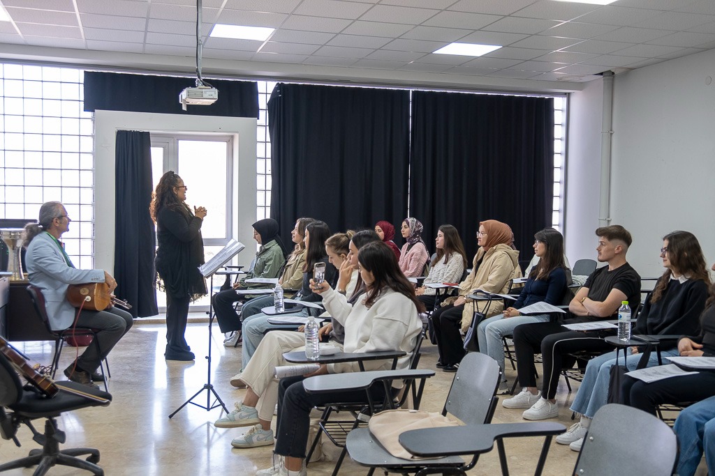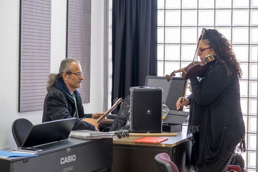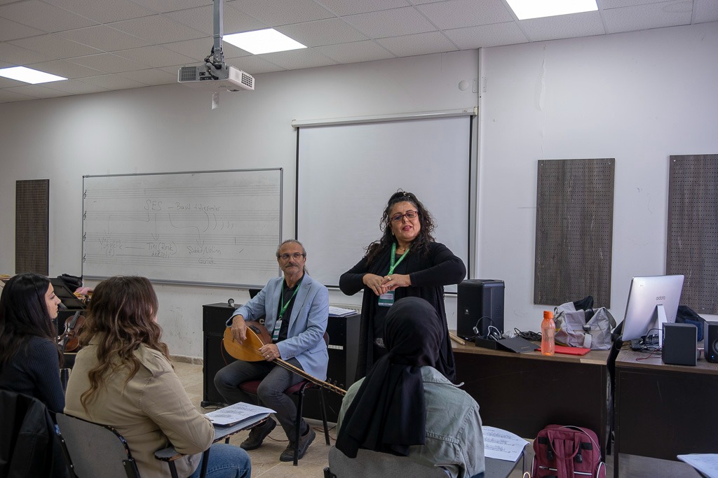 Kemanda Öğr. Gör. Gamze Çalık Çetin ve bağlamada Öğretmen İbrahim Çetin eğitmenliğinde düzenlenen atölye uygulamasında, “Beyaz Giyme Toz Olur”, “Tombalacık Halimem” ve “Benden Selam Olsun Bolu Beyine” türkülerinin basitten zora ritim çalışmaları, keman ve bağlama eşliğinde yapıldı.