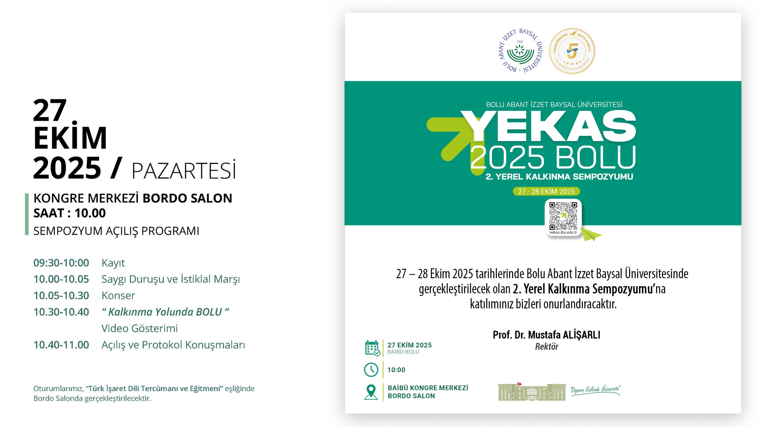 Bolu Abant İzzet Baysal Üniversitesi Ekonomik ve Sosyal Araştırmalar Merkezi (ESAM) tarafından 27-28 Ekim 2025 tarihlerinde düzenlenecek olan 2. Yerel Kalkınma Sempozyumu, “Sürdürülebilirlik Ekseninde Bolu’nun Geleceği: Sektörel Analizler ve Politika Önerileri” ana temasıyla gerçekleştirilecektir. Sempozyumda, Bolu’nun geleceğine yönelik sürdürülebilir kalkınma vizyonu farklı yönleriyle ele alınacaktır.