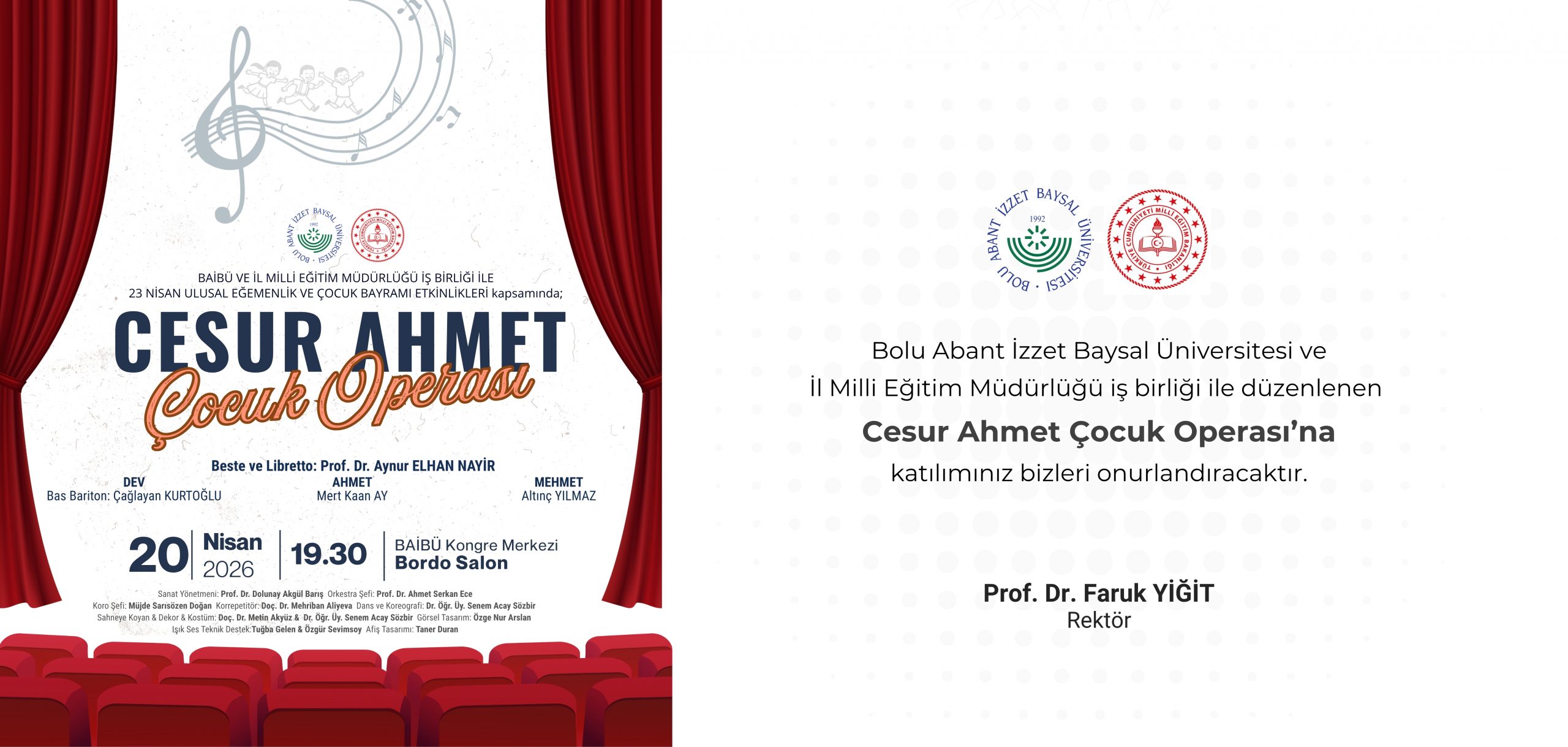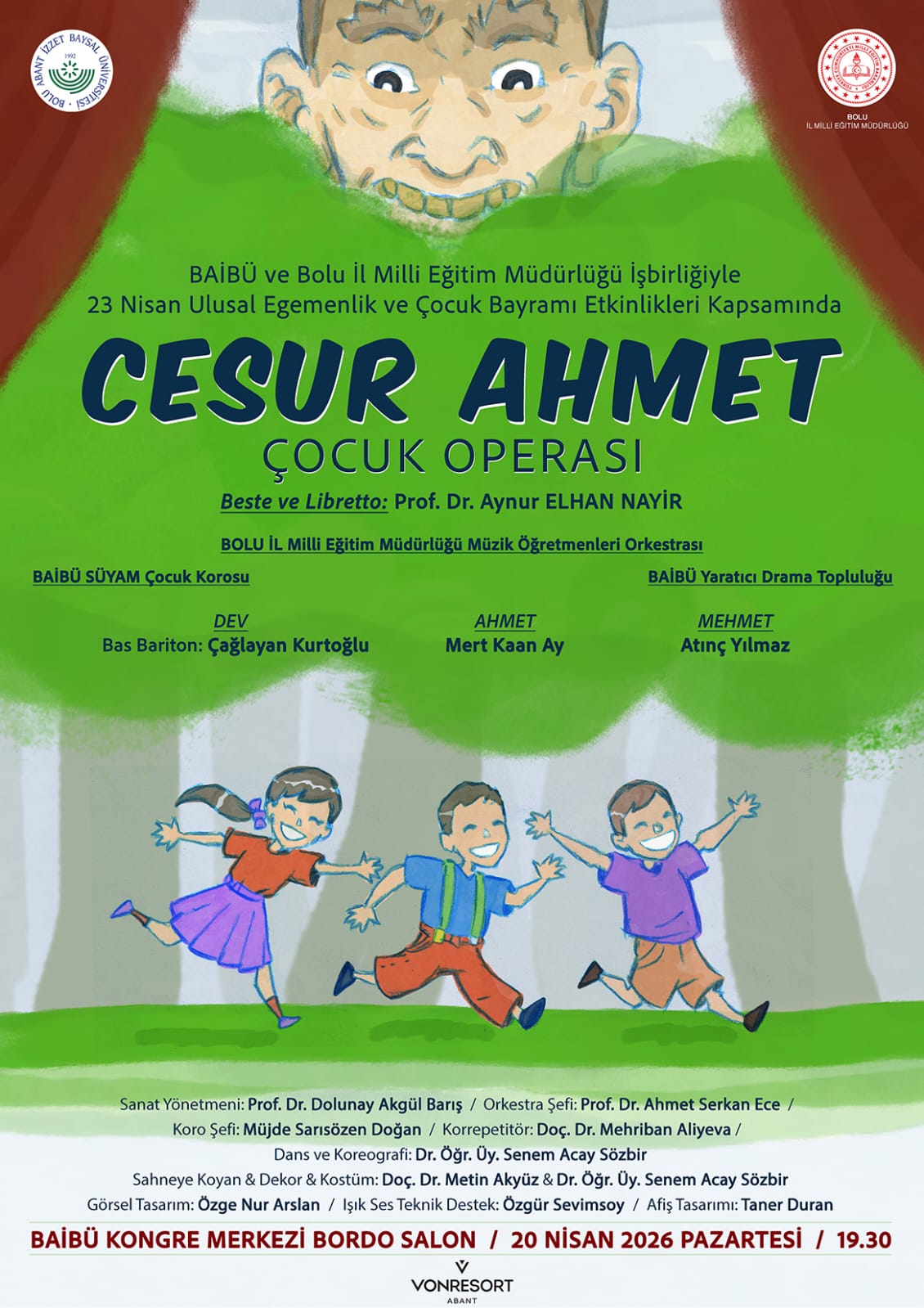 Sanatın büyüsünü çocuklarımızla buluşturuyoruz. Prof. Dr. Aynur Elhan Nayir’in kaleme aldığı ve bestelediği “Cesur Ahmet Çocuk Operası” için sahne perdeleri açılıyor. SÜYAM Çocuk Korosu, Milli Eğitim Müdürlüğü Müzik Öğretmenleri Orkestrası ve Yaratıcı Drama Topluluğu’nun katılımıyla hazırlanan bu özel gösteriye hepiniz davetlisiniz.