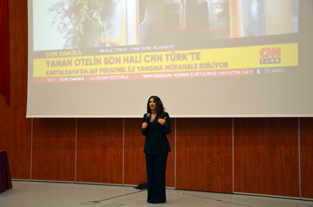 CNN Türk kanalının deneyimli muhabiri Merve Tokaz, medya sektörüne ve gazetecilik mesleğine ilgi duyan öğrencilerle bir araya geldi. Üniversitemiz Genç Fikirler Topluluğu tarafından “Televizyonda Olmak Senin de Hedefinse Bu Etkinlik Tam Sana Göre!” mottosuyla duyurulan söyleşide Tokaz, haberci gözüyle edindiği deneyimleri paylaşarak gençlere televizyon muhabirliği ve gazetecilik konusunda ilham verdi.