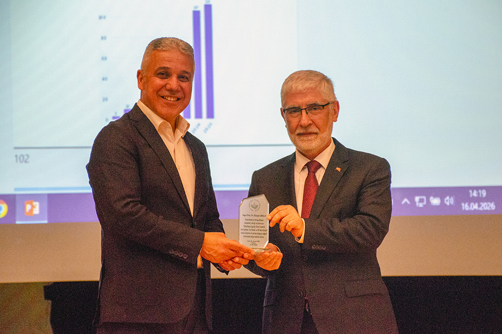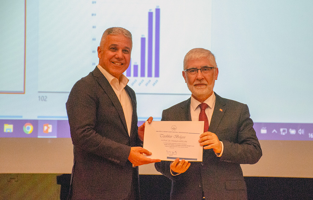 Konferansın sonunda Üniversitemiz Rektörü Prof. Dr. Faruk Yiğit, TÜBA Asli Üyesi ve Medipol Üniversitesi Öğretim Üyesi Prof. Dr. Hüseyin Arslan’a teşekkür belgesi ve plaket verdi.