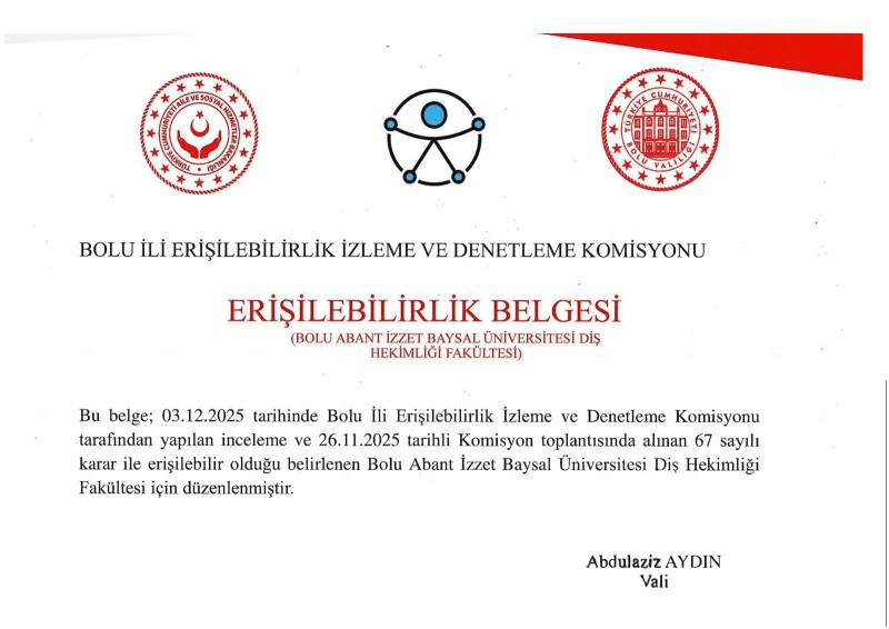 BAİBÜ Diş Hekimliği Fakültesi, tamamlanan erişilebilirlik çalışmaları sonucunda Bolu İli Erişilebilirlik İzleme ve Denetleme Komisyonu tarafından erişilebilirlik belgesi ile tescillendi.