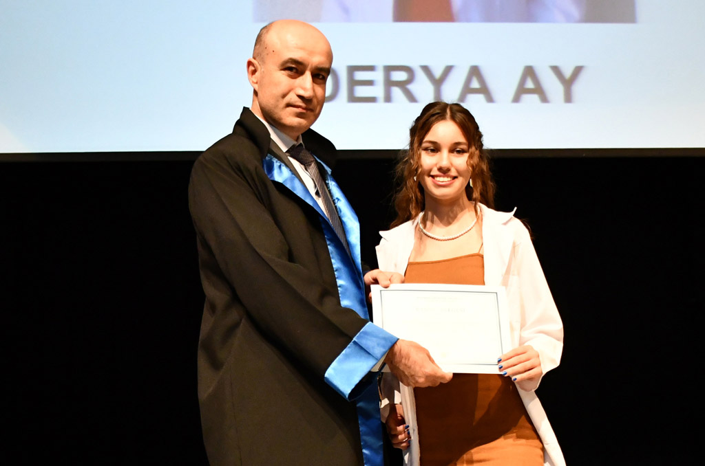 Prof. Dr. Keleş konuşmasının ardından Diş Hekimliği Fakültesi’ne dereceyle yerleşen Derya Ay’a başarı belgesini verdi ve beyaz önlüğünü giydirdi.