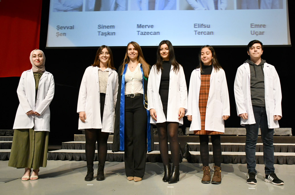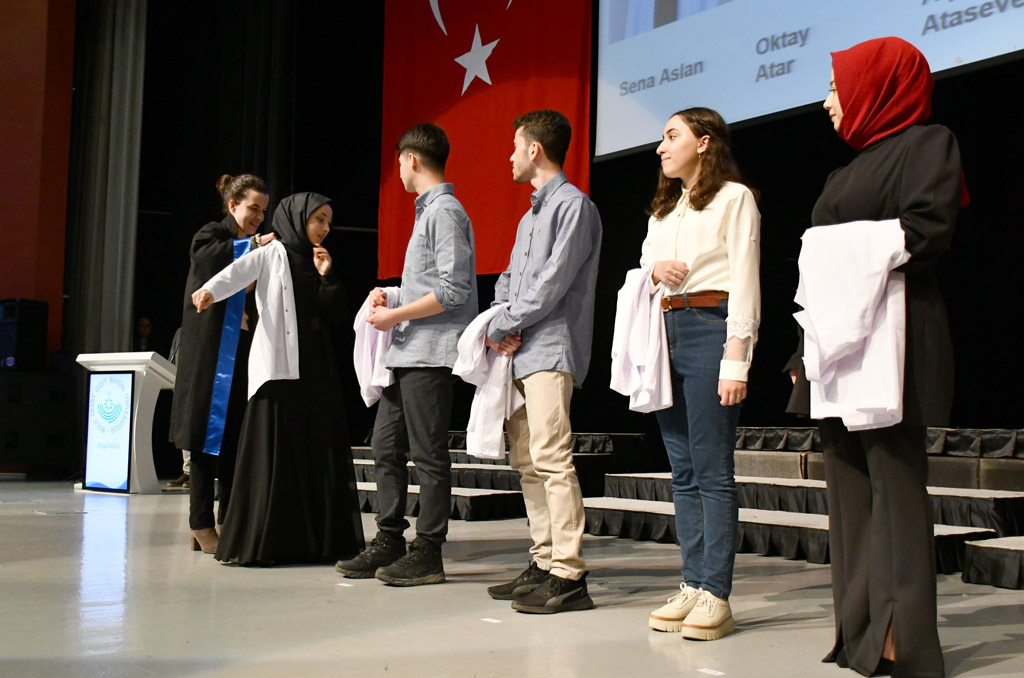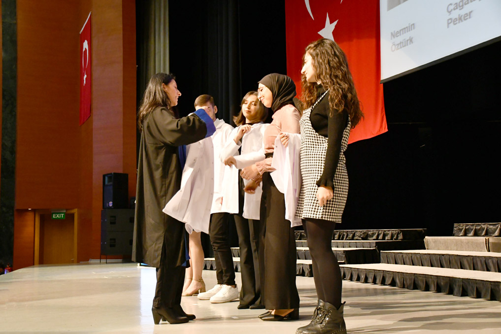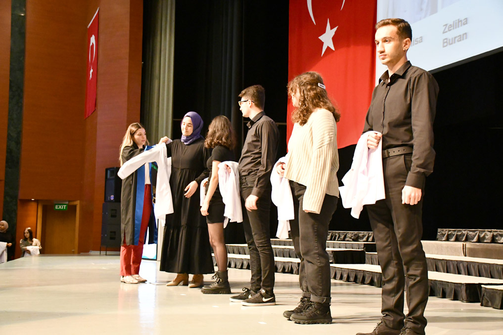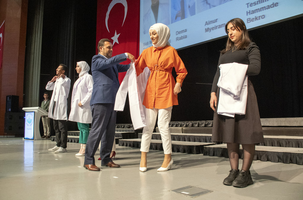 Vali Yardımcısı Şen, konuşmasının ardından fakülteye dereceyle giren Sıla Kaya’ya başarı belgesini verdi ve beyaz önlüğünü giydirdi.