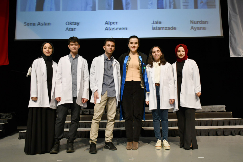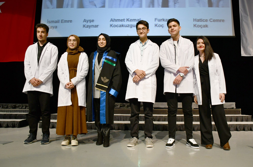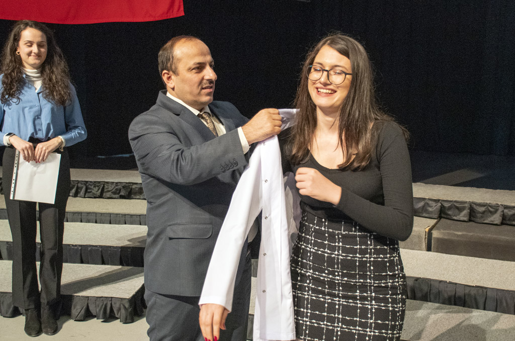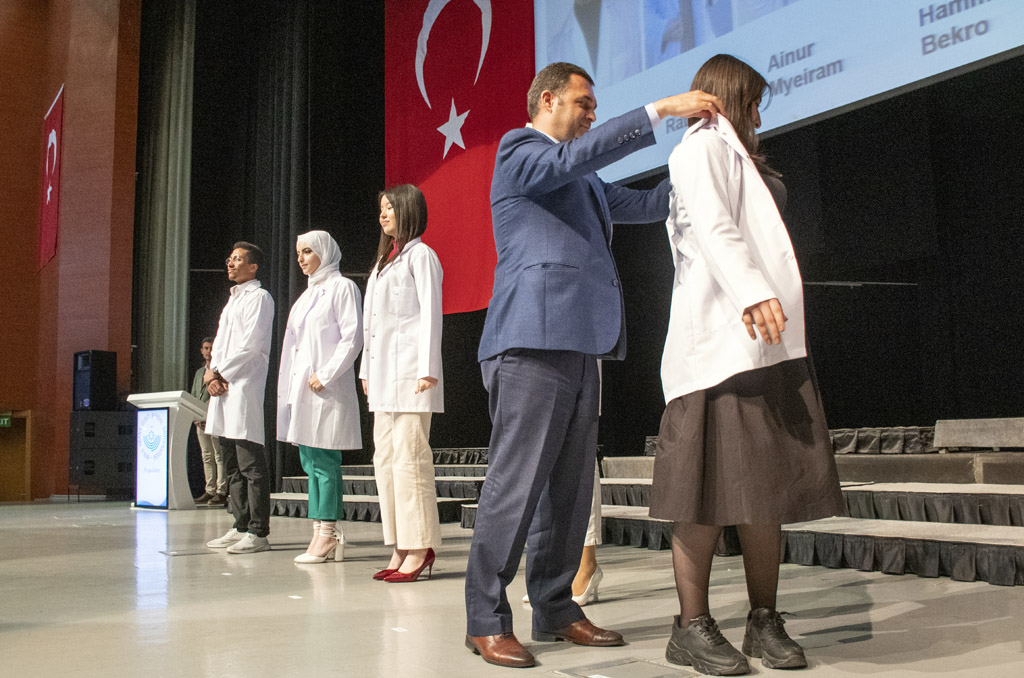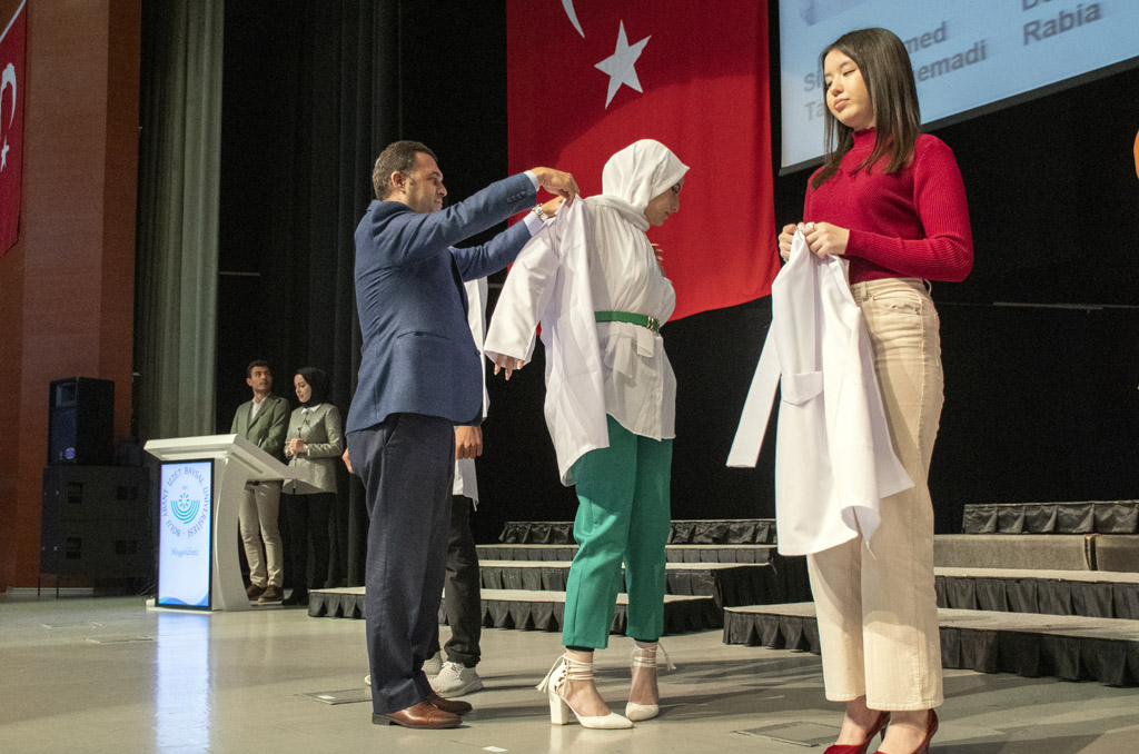 Vali Yardımcısı Şen, konuşmasının ardından fakülteye dereceyle giren Sıla Kaya’ya başarı belgesini verdi ve beyaz önlüğünü giydirdi.