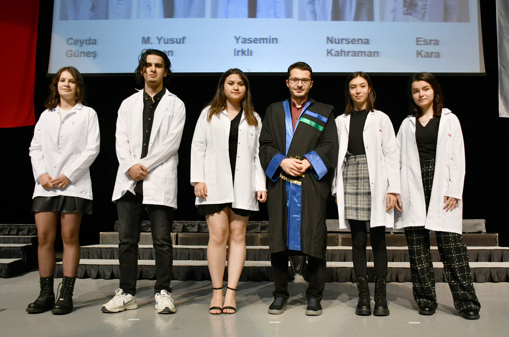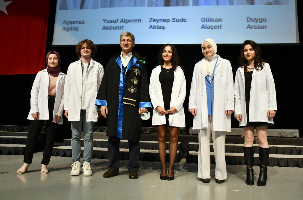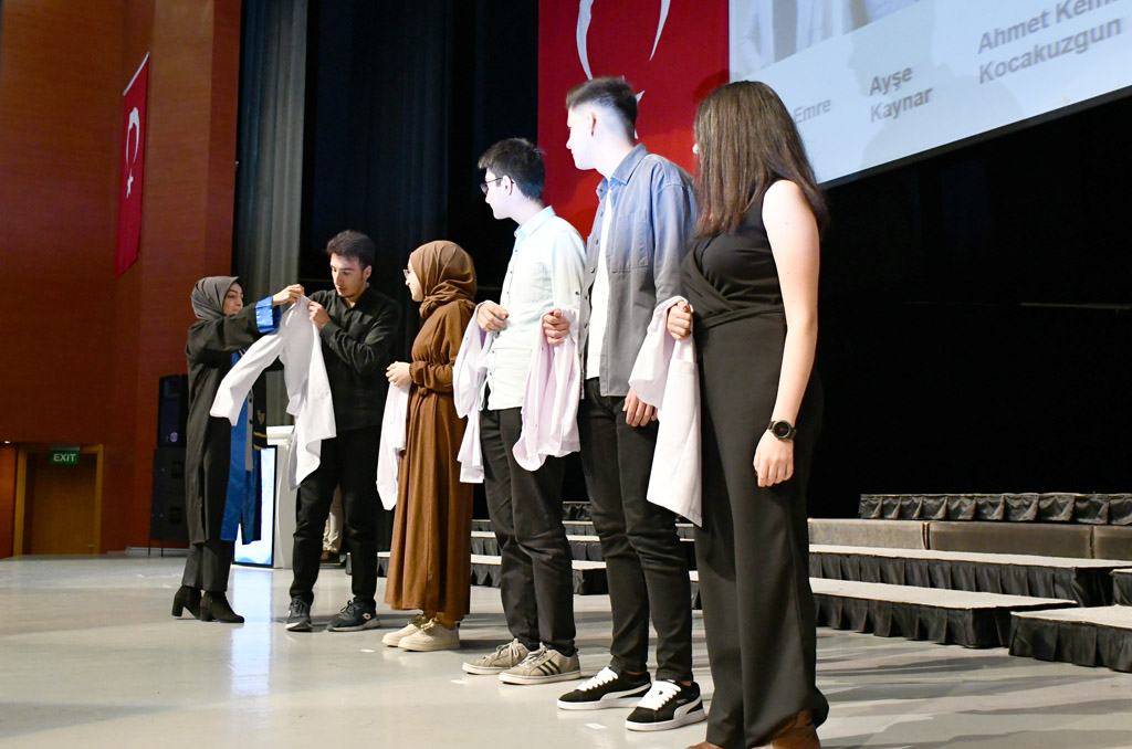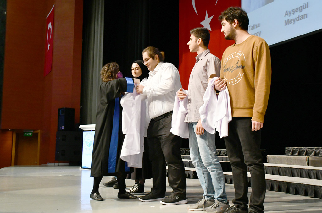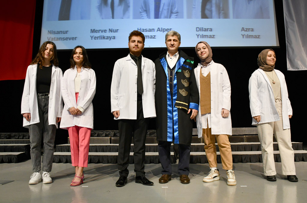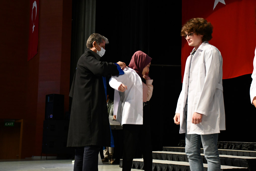Konuşmasının ardından Rektör Alişarlı, fakülteye dereceyle giren İlyas Hançer’e başarı belgesini verdi ve beyaz önlüğünü giydirdi.