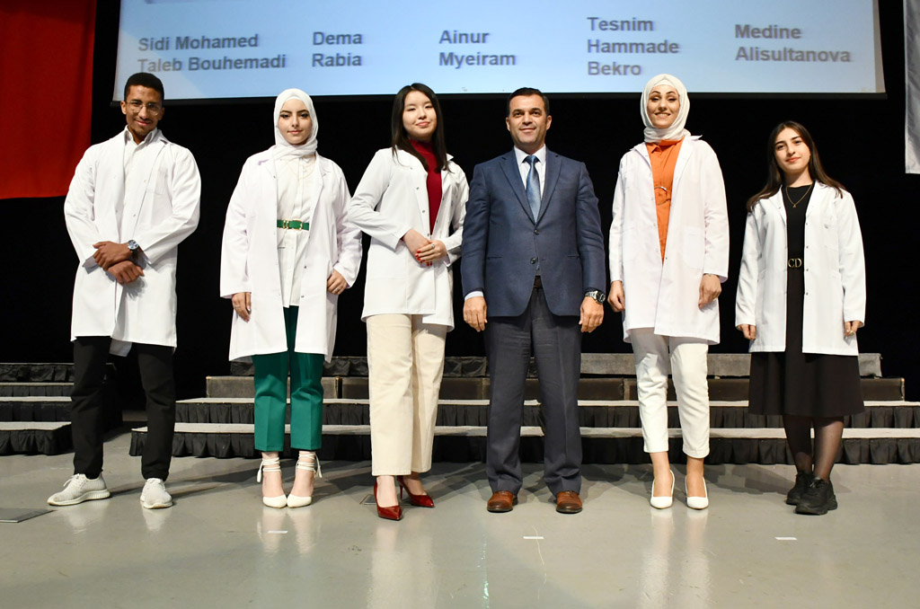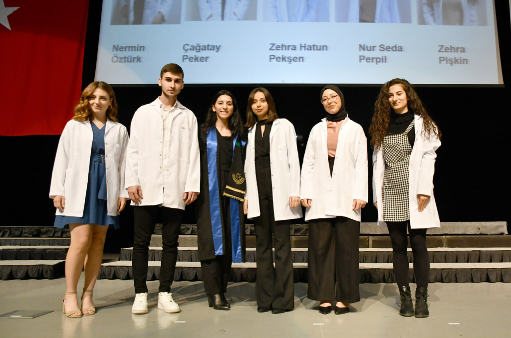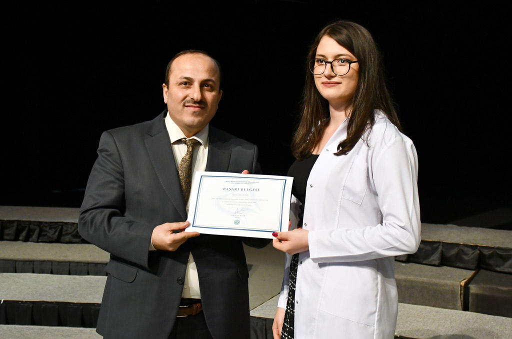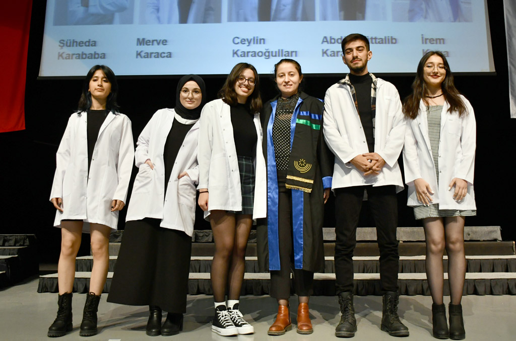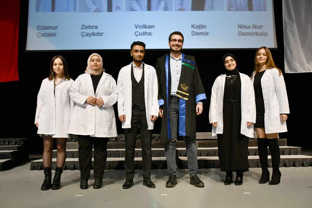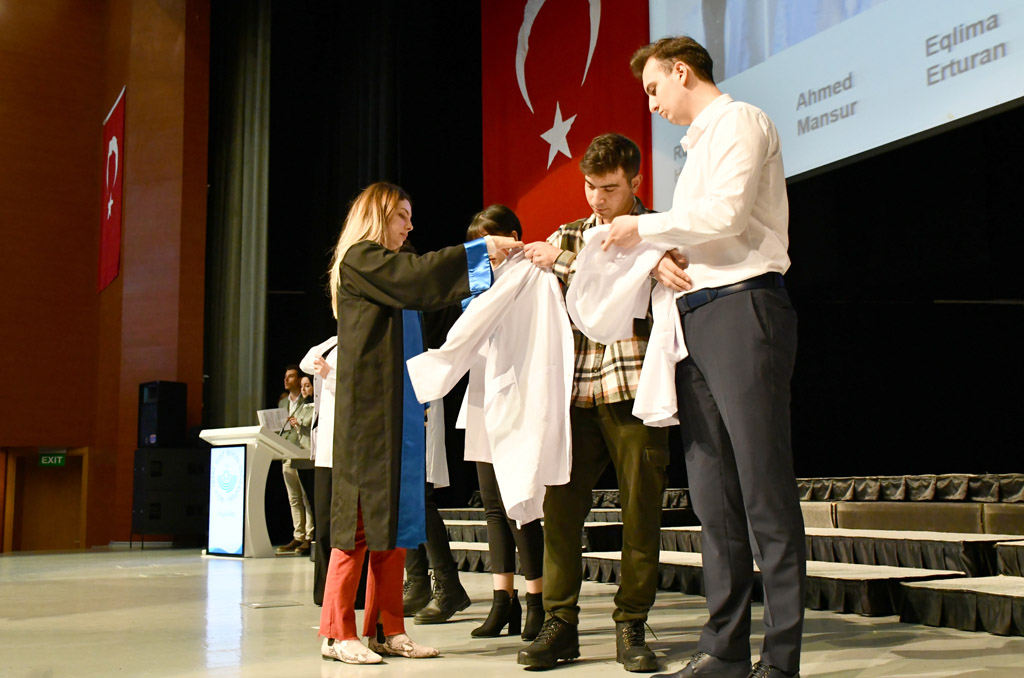 Konuşmasının ardından Rektör Alişarlı, fakülteye dereceyle giren İlyas Hançer’e başarı belgesini verdi ve beyaz önlüğünü giydirdi.