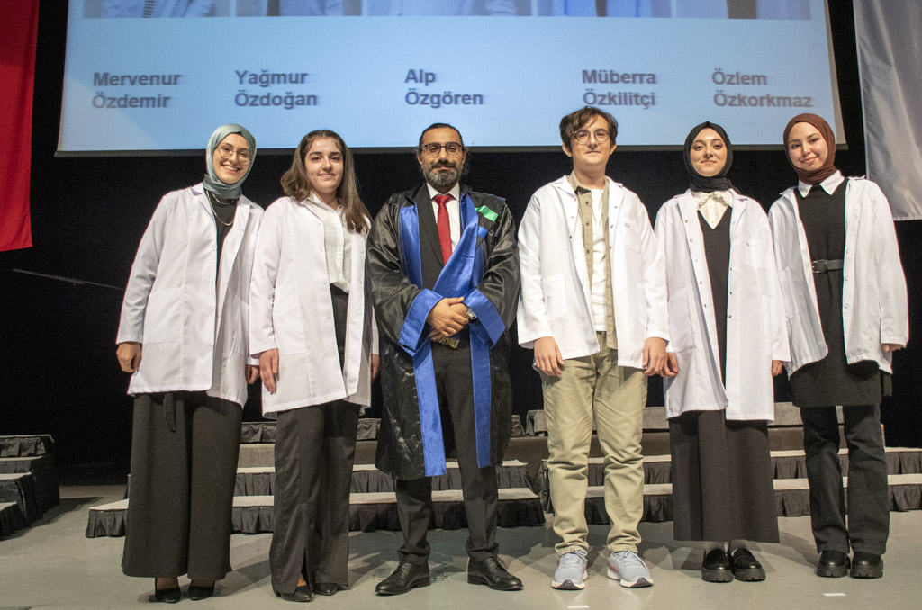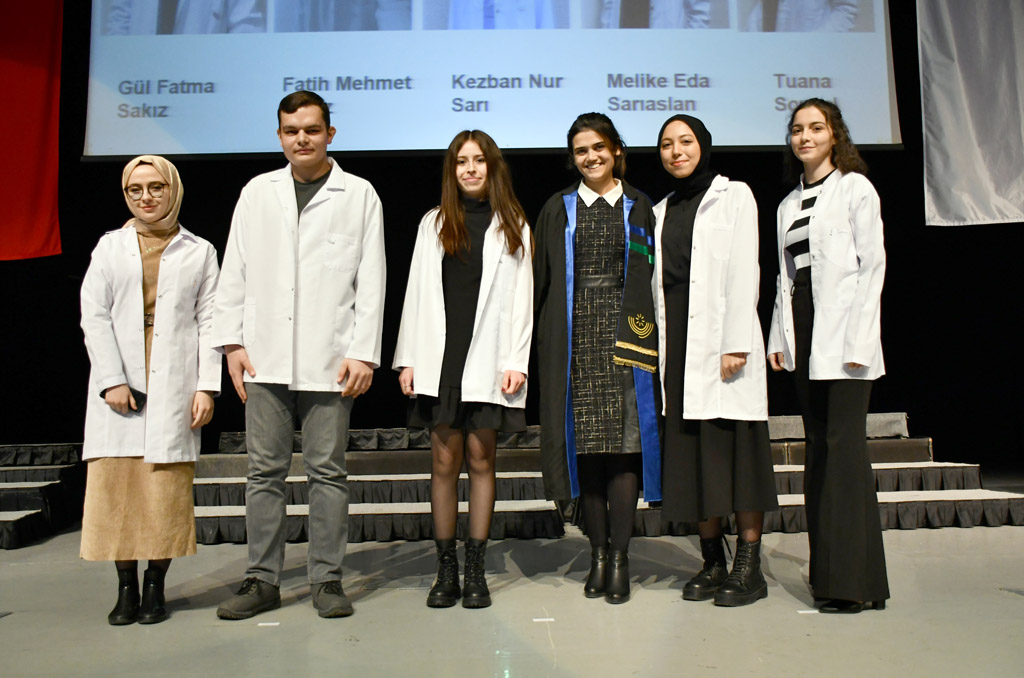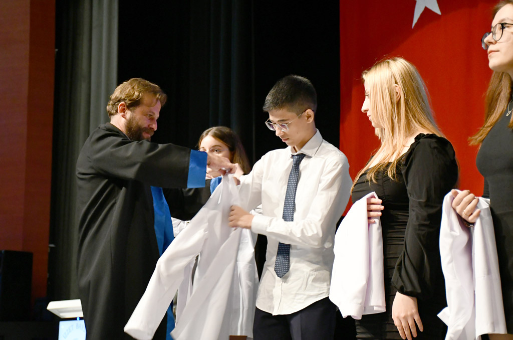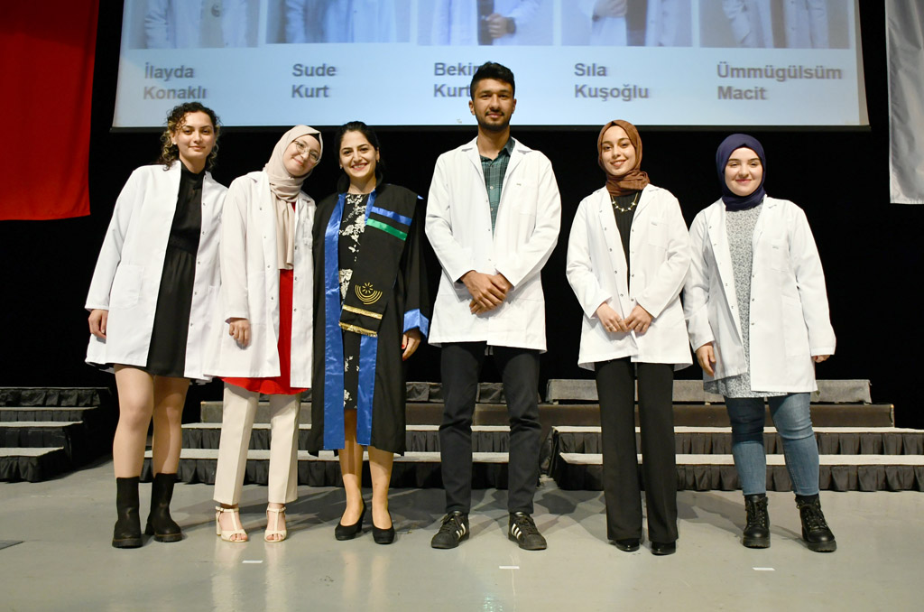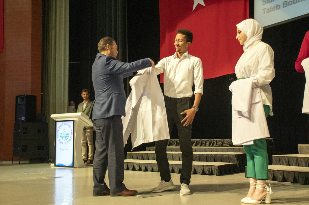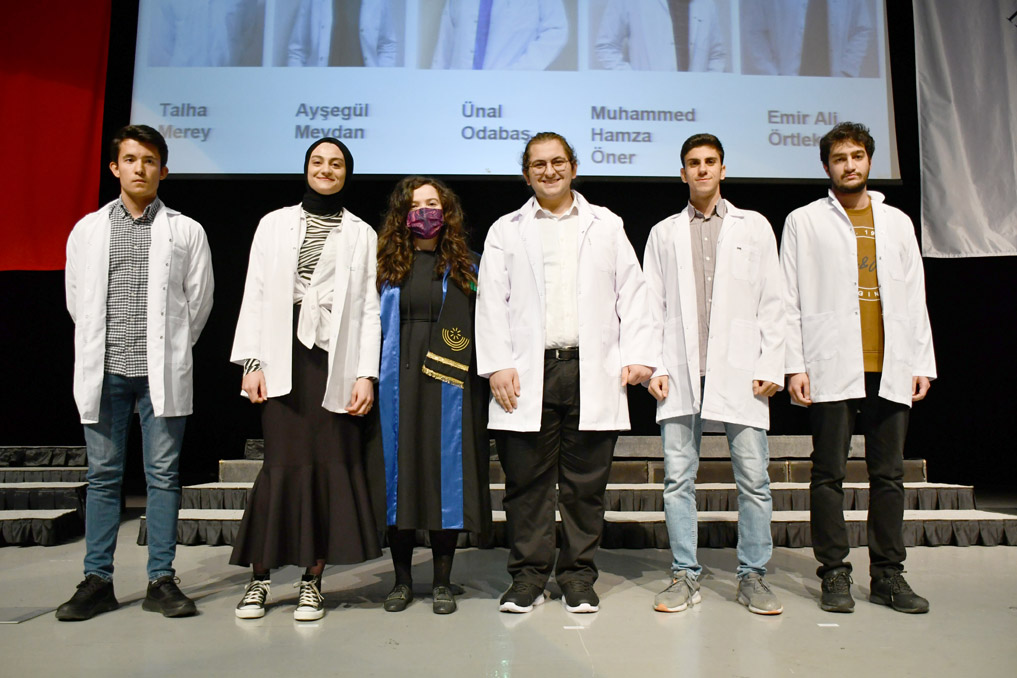 Konuşmasının ardından Rektör Alişarlı, fakülteye dereceyle giren İlyas Hançer’e başarı belgesini verdi ve beyaz önlüğünü giydirdi.