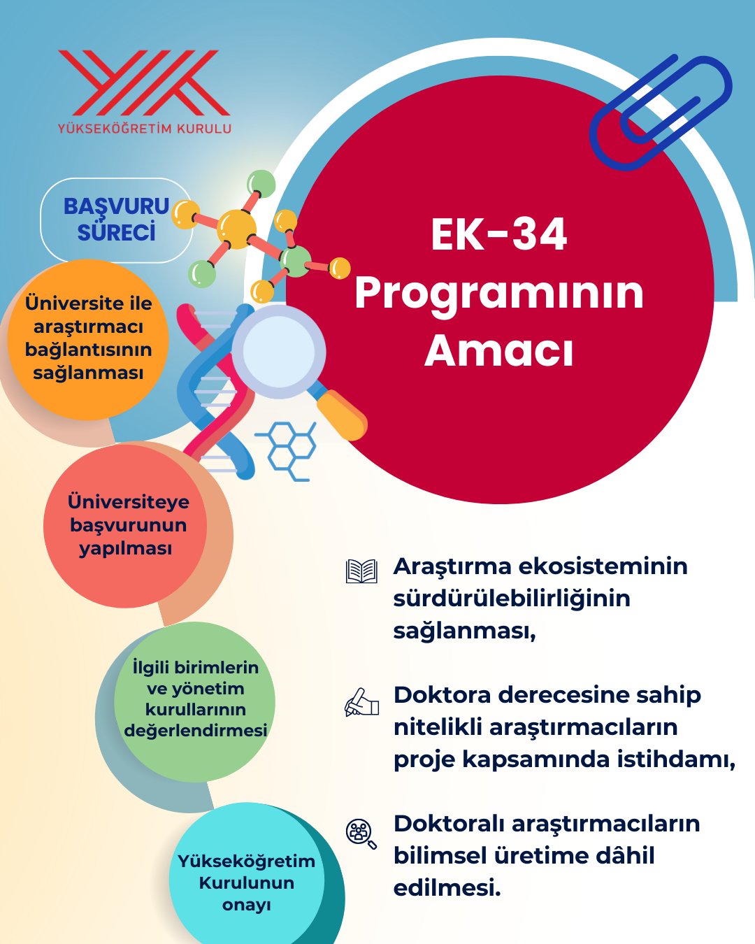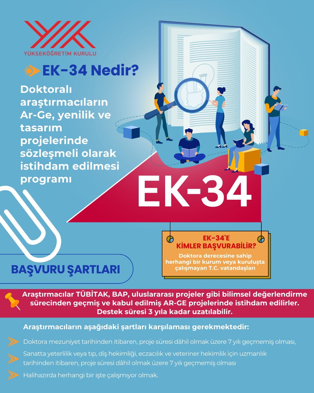 Yükseköğretim Kurulu (YÖK) himayesinde 2547 sayılı Yükseköğretim Kanununun Ek-34. Maddesi kapsamında, üniversitelerce yürütülecek Ar-Ge projelerinde doktora mezunları sözleşmeli araştırmacı olarak istihdam edilecek.